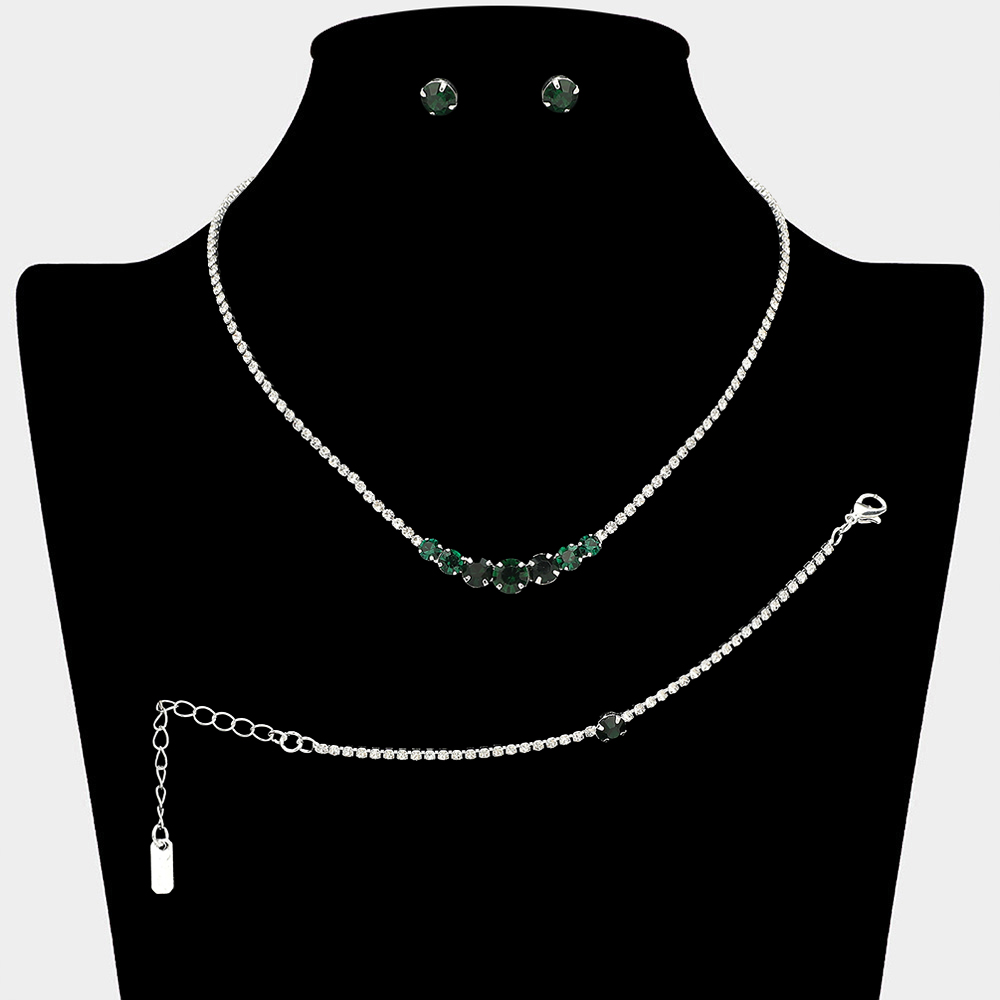 Details • Necklace Size : 15" + 4.5" L • Decor Size : 0.3" L • Bracelet Size : 0.25" H, 5.25" + 2.25" L • Earrings Size : 0.25" L • Timeless matching necklace, stud earring, and bracelet set designed with a clean round stone centerpiece for effortless elegance. Ideal for weddings, formal events, parties, and everyday special occasion styling. A versatile set that delivers refined sparkle and coordinated sophistication.