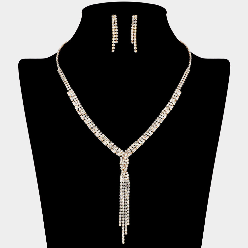 • Stylish Y-drop necklace and earring set featuring a cz rhinestone tassel pendant and matching linear earrings. The sleek, cascading design adds a touch of glamour, perfect for evening wear, parties, and formal occasions.