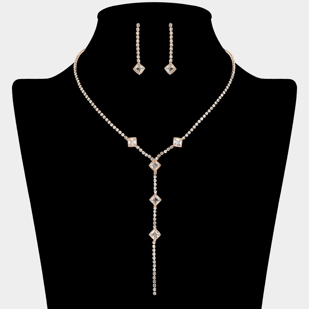 Details • Necklace Size : 13.5" + 5" L • Decor Size : 3.5" L • Earrings Size : 1.3" L • Refine your look with this Geometric Drop CZ Crystal Necklace and Earring Set. Featuring a delicate chain with square-cut stones that form an elegant drop design, this set brings a graceful sparkle to any ensemble—perfect for evening events, weddings, or adding sophistication to formal wear. • CZ Cubic Zirconia • Lead and Nickel Compliant