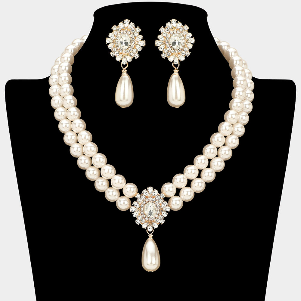 Glamours Oval Rhinestone Pendant Accent Double Strand Pearl Necklace Glamours Oval Rhinestone Pendant Accent Double Strand Pearl Necklace