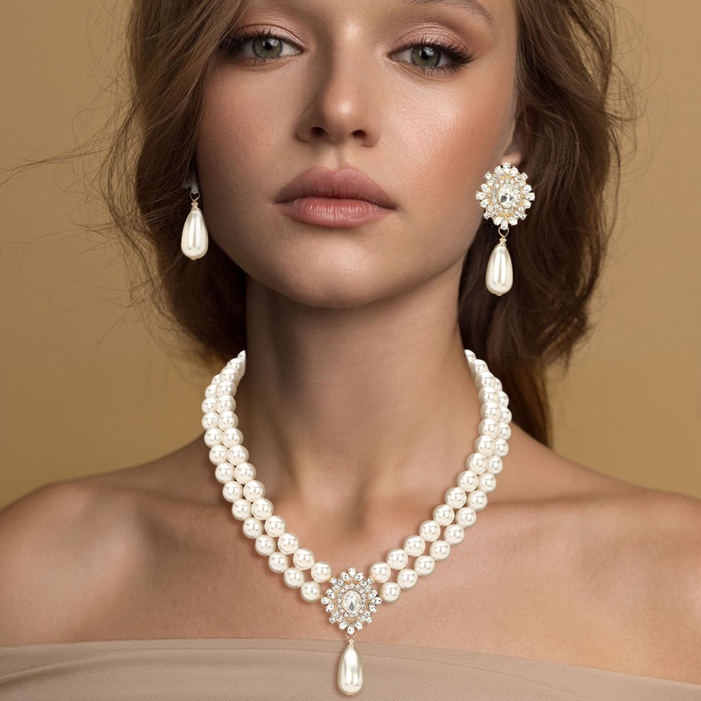Glamours Oval Rhinestone Pendant Accent Double Strand Pearl Necklace