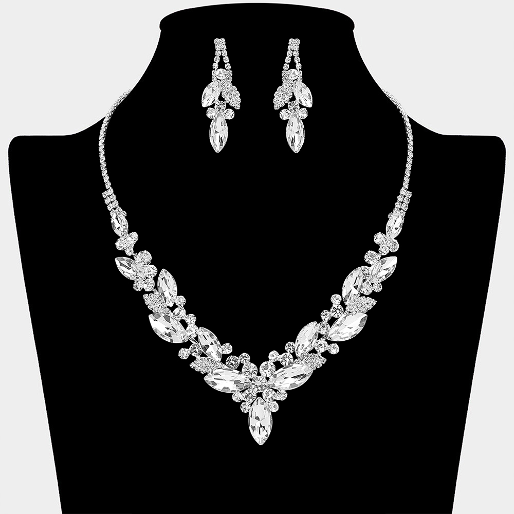 • Make a bold impression with this statement necklace and earring set featuring striking marquise and teardrop accents arranged in an elegant silhouette. Designed for formal events, evening wear, proms, and special celebrations, this coordinated set delivers eye-catching sparkle and confident, glamorous style.