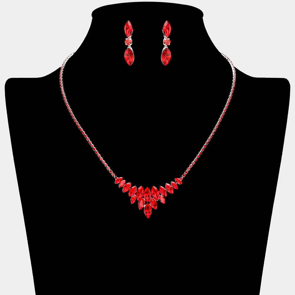 • Elegant marquise cut rhinestone statement set featuring a dramatic V-shaped drop necklace constructed from cascading stones and a delicate line chain. The sophisticated necklace pairs perfectly with the included dangle earrings. Ideal accessories for brides, proms, galas, and formal events. This stunning set makes a bold and dazzling style statement.
