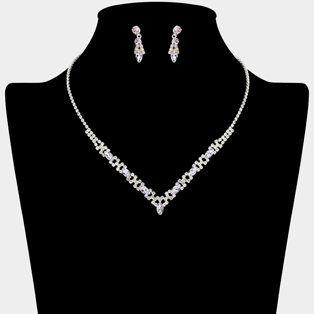 • Refined necklace and earring set designed with a sleek V-shaped silhouette and coordinated accents for a polished look. Perfect for weddings, formal events, parties, and evening wear. A timeless set that enhances special occasion styling with subtle elegance and sophistication.