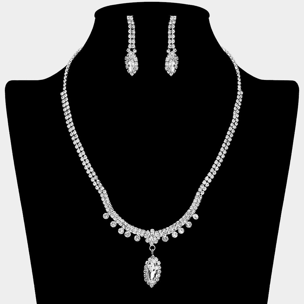 Details • Necklace Size : 17" + 5.5" L • Decor Size : 1.5" L • Earrings Size : 1.5" L • Elegant necklace and earring set featuring a teardrop pendant surrounded by shimmering stones. With its delicate detailing and refined sparkle, this timeless jewelry set is perfect for weddings, proms, or evening occasions, adding graceful sophistication to any formal ensemble. • Lead and Nickel Compliant