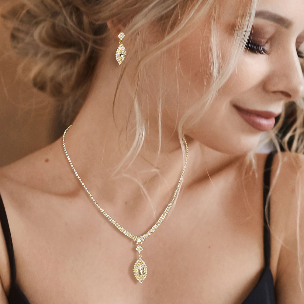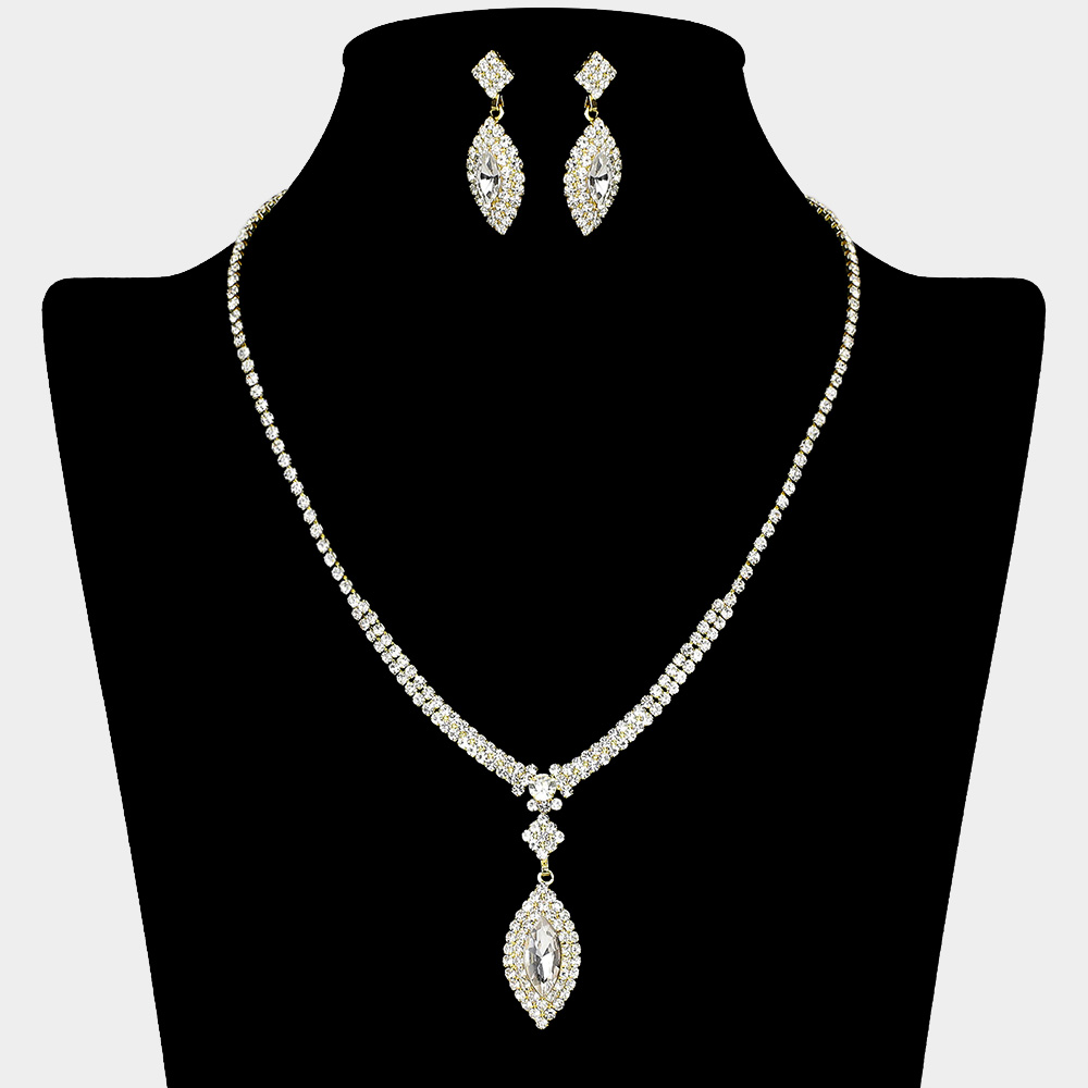 Details • Necklace Size : 16.5" + 4.5" L • Decor Size : 1.8" L • Earrings Size : 1.4" L • Elegant marquise pendant rhinestone necklace and earring set featuring a refined crystal drop design with dazzling brilliance. Perfect for weddings, proms, and special occasions, this jewelry set enhances your look with timeless sophistication and radiant sparkle.