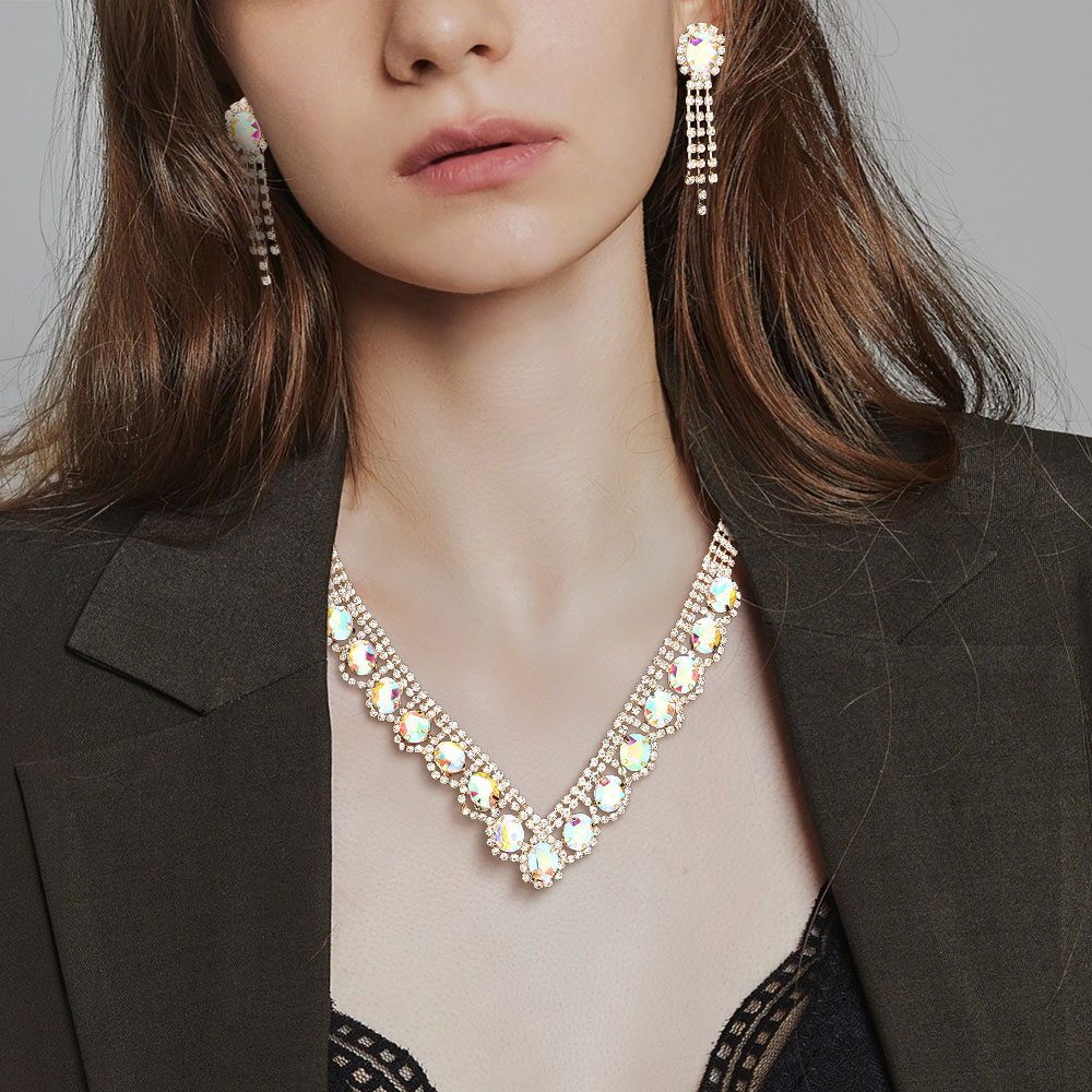 • Radiate sophistication with this rhinestone necklace and earring set featuring a graceful V-shaped design. The shimmering stones create a timeless look, ideal for weddings, evening events, and formal occasions. A refined jewelry set that captures elegance and glamour.