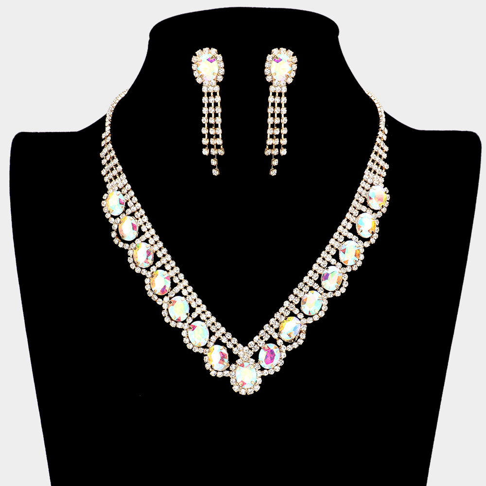 Oval Stone Accented V Shaped Rhinestone Necklace