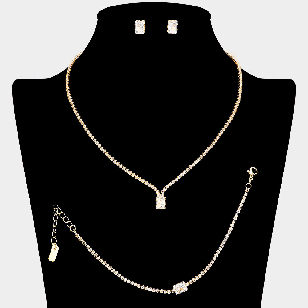 Rectangle Stone Pointed Rhinestone Paved Necklace Jewelry Set