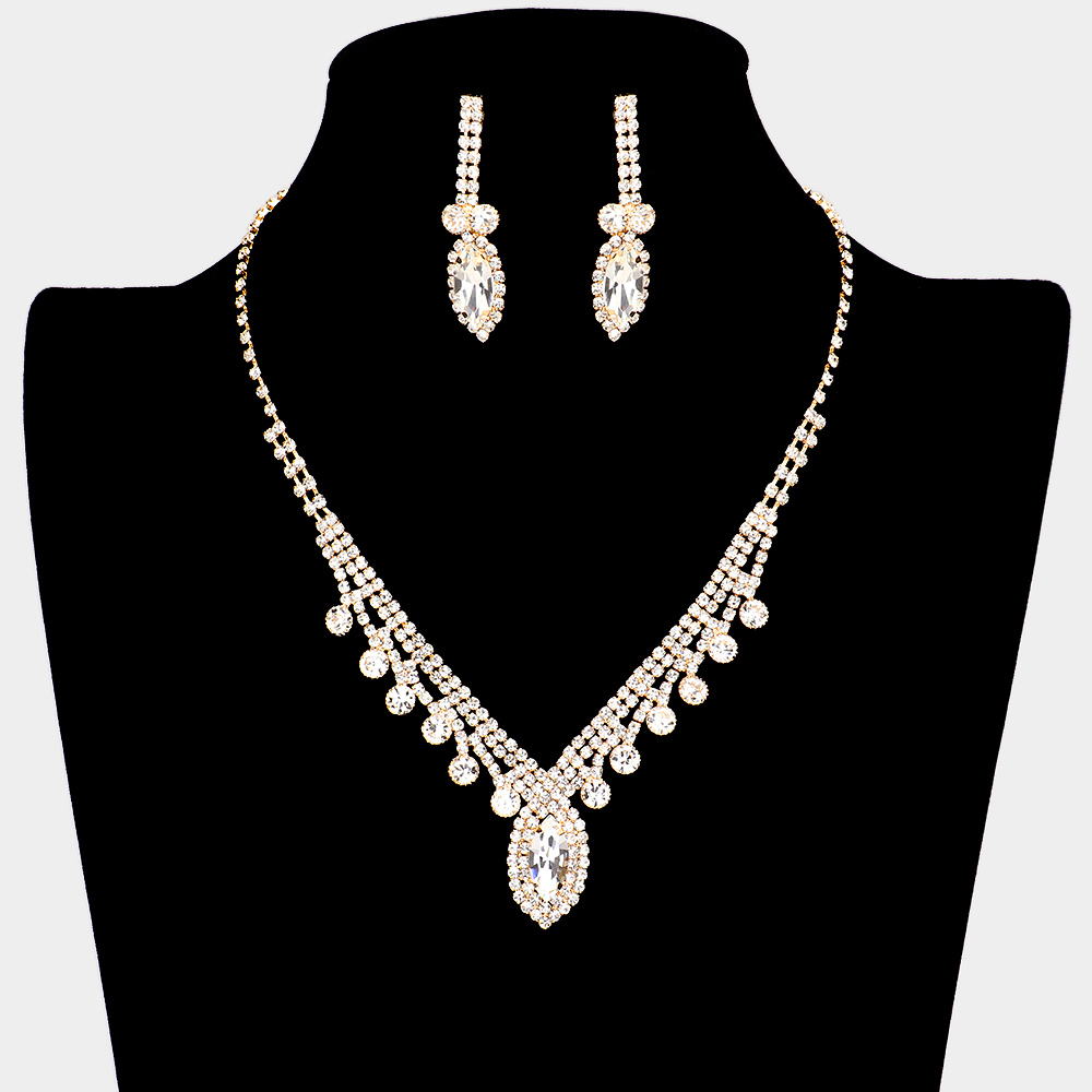 Details • Necklace Size : 16" + 4.5" L • Decor Size : 1" L • Earring Size : 1.75" L • Elegant teardrop crystal necklace and earring set designed for formal occasions. Features sparkling stones and a delicate drop pattern for a timeless look. Perfect for weddings, proms, and evening events, adding a refined touch of glamour and sophistication to any outfit. • Lead and Nickel Compliant