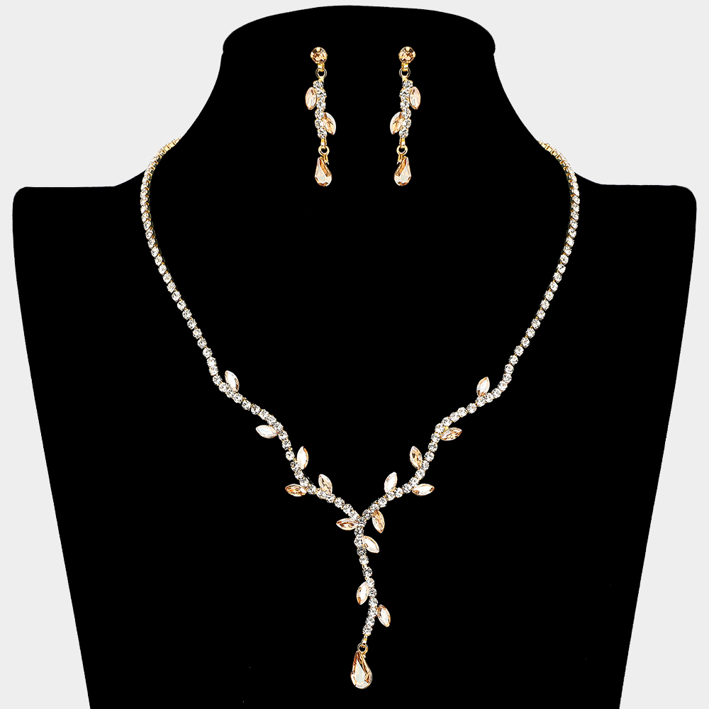 • Elegant necklace and earring set with shimmering leaf-shaped stones and a delicate drop pendant. Perfect for weddings, proms, and special events for a refined and glamorous look.