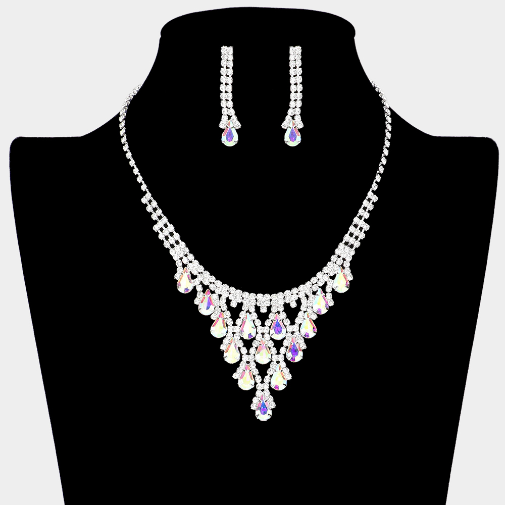 • Elevate your elegance with this rhinestone necklace and earring set featuring cascading teardrop accents. Perfect for weddings, galas, and evening events, this sparkling jewelry set adds timeless sophistication and glamour to any special occasion look.