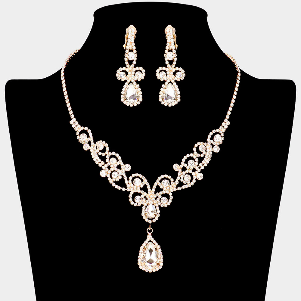 • Enhance your elegance with this rhinestone necklace and earring set featuring a teardrop pendant and intricate scroll design. Perfect for weddings, galas, and evening events, this jewelry set brings timeless sophistication and sparkle to any formal look.
