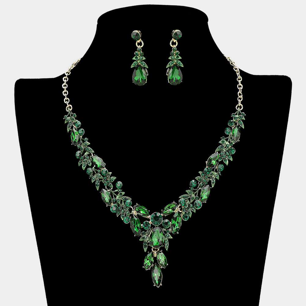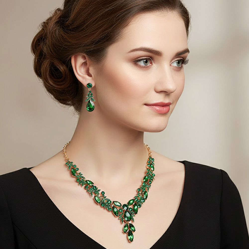 • Glamorous jewelry set featuring an intricate rhinestone statement necklace with cascading teardrop/leaf designs and matching dangle earrings. Perfect for bridal, prom, or formal events.