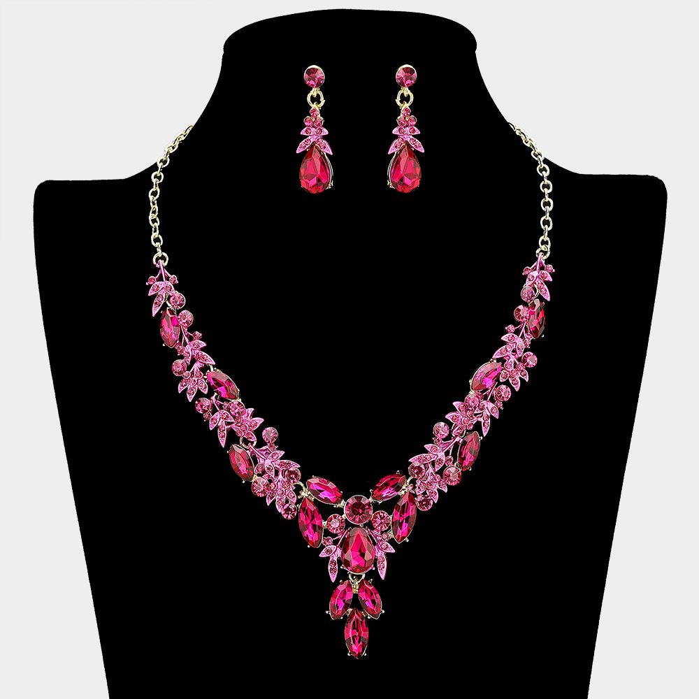 • Glamorous jewelry set featuring an intricate rhinestone statement necklace with cascading teardrop/leaf designs and matching dangle earrings. Perfect for bridal, prom, or formal events.