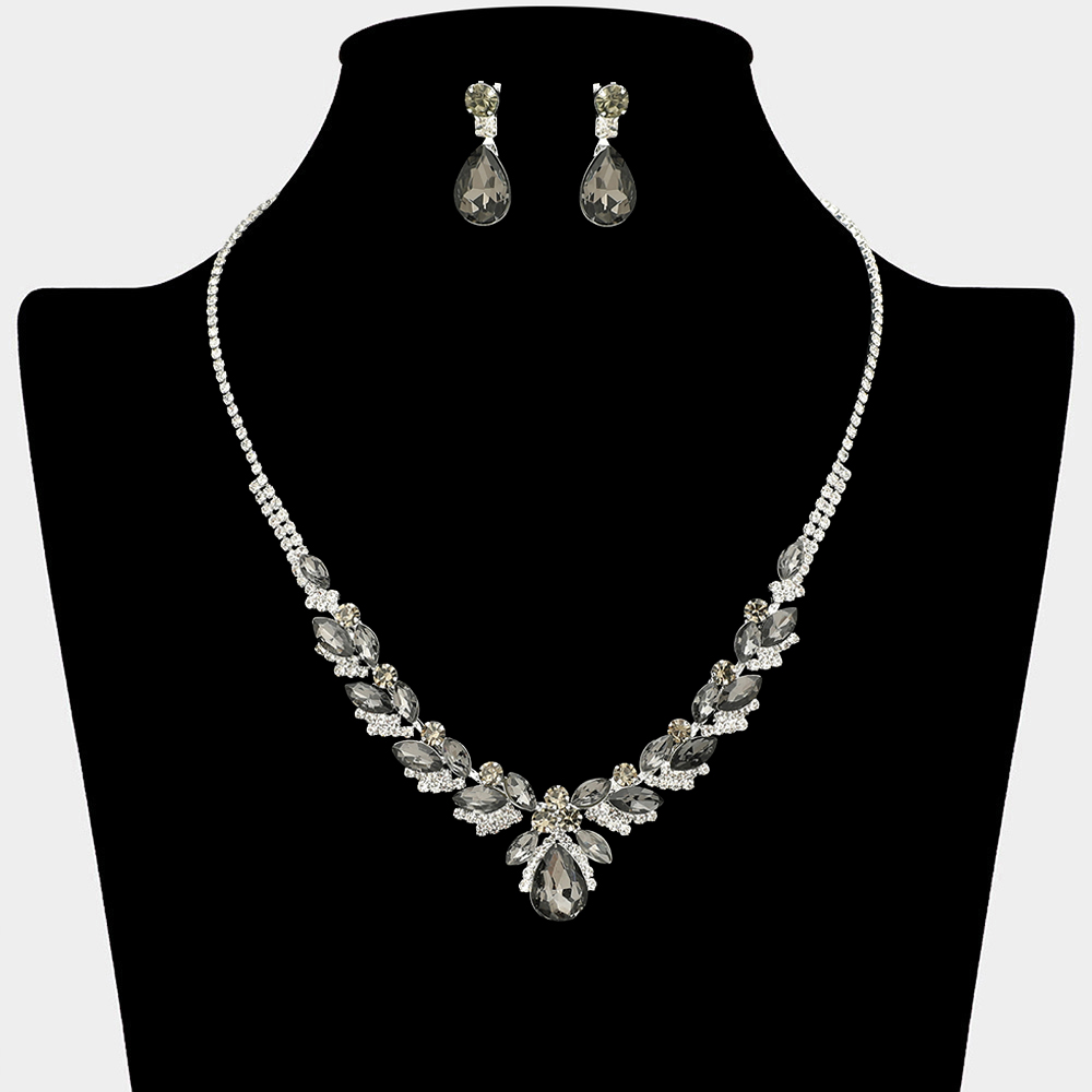• This elegant statement necklace and matching earring set features layered teardrop accents that create a dramatic yet refined silhouette. Designed to highlight the neckline with graceful sparkle, it is ideal for formal occasions, bridal styling, evening events, and upscale boutique collections.
