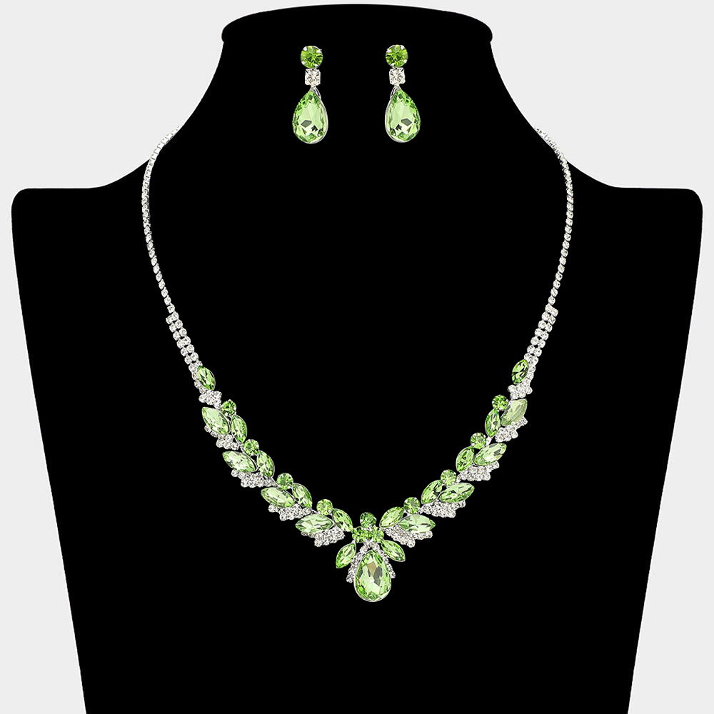 Details • Necklace Size : 17" + 4" L • Decor Size : 1" L • Earrings Size : 1" L • This elegant statement necklace and matching earring set features layered teardrop accents that create a dramatic yet refined silhouette. Designed to highlight the neckline with graceful sparkle, it is ideal for formal occasions, bridal styling, evening events, and upscale boutique collections.