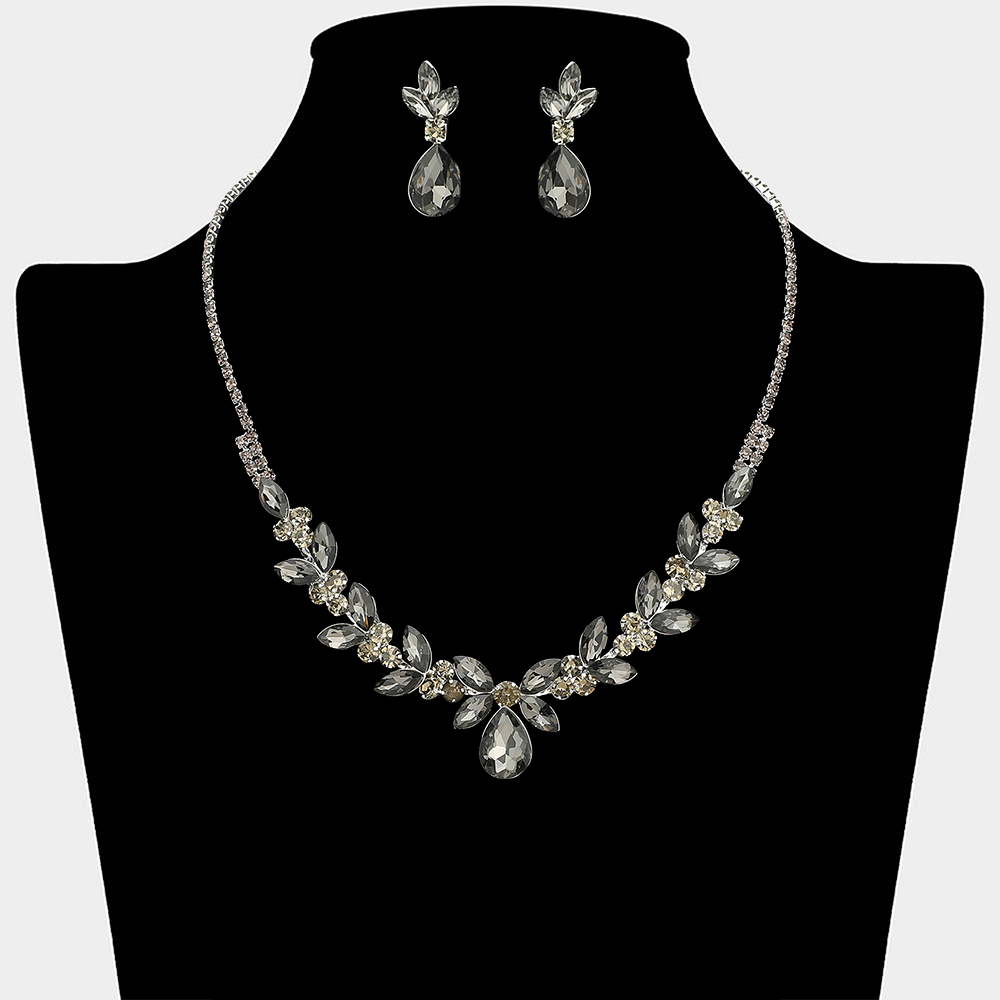 • This elegant necklace and matching earring set features a leaf-inspired design with a graceful drop centerpiece that frames the neckline beautifully. Perfect for weddings, formal events, proms, and evening occasions, it adds refined sparkle and a timeless statement to special occasion looks.