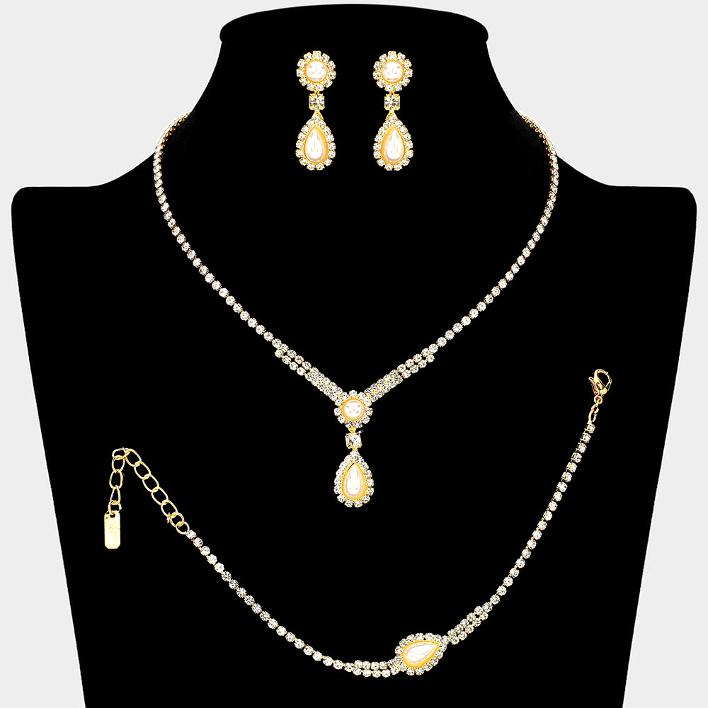Teardrop Pearl Pendant Accent Rhinestone Paved Jewelry Set