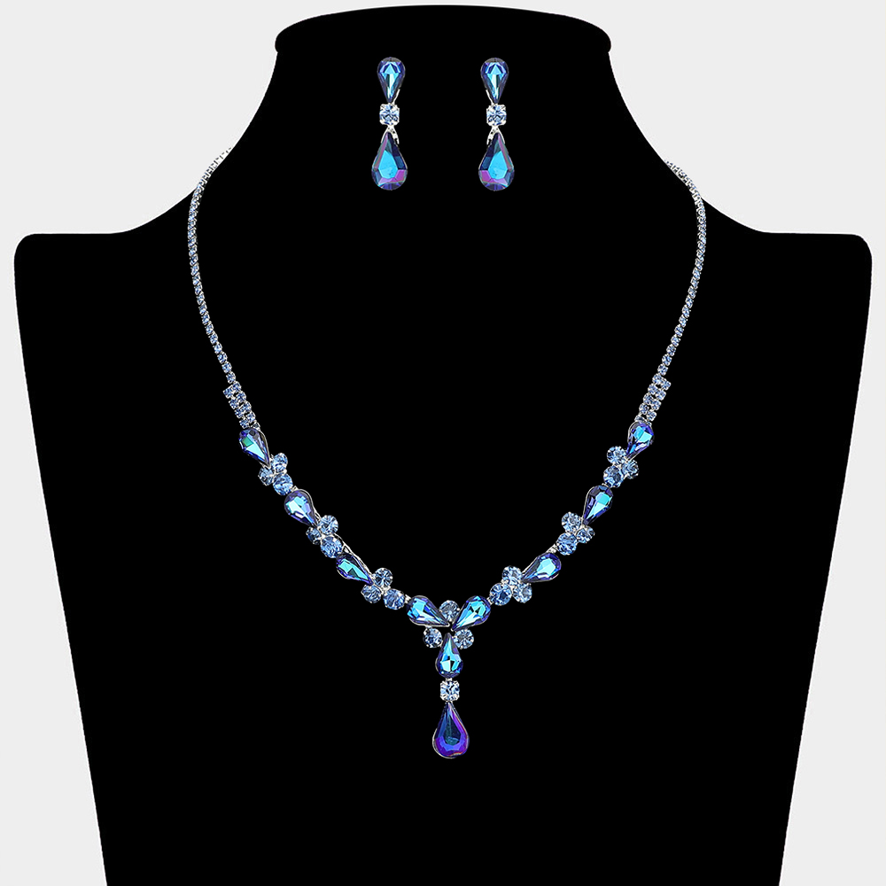 • This elegant necklace and earring set features a graceful teardrop crystal design that highlights the neckline with refined sparkle. Ideal for weddings, bridal looks, formal occasions, and evening wear, it delivers a timeless statement that complements gowns, dresses, and special event styling with effortless sophistication.