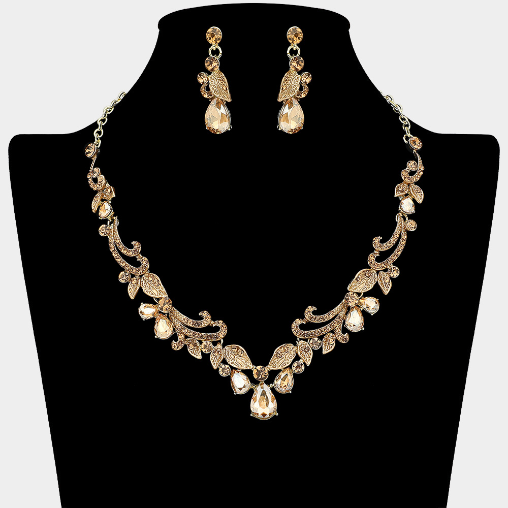 • Dazzling necklace and earring set featuring teardrop crystals with intricate leaf accents. Perfect for weddings, pageants, or evening events, this set adds a refined and elegant touch to any special occasion look.