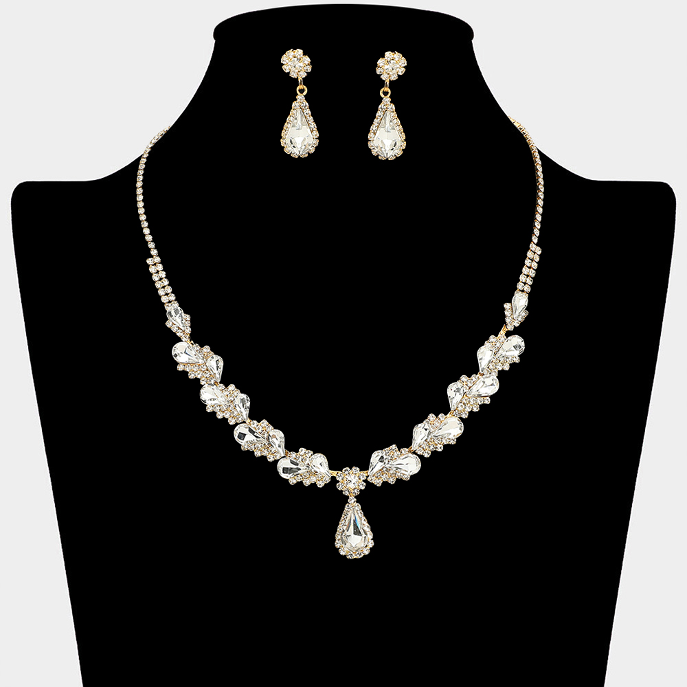 Details • Necklace Size : 16.5" + 4.25" L • Decor Size : 1" L • Earrings Size : 1.25" L • This teardrop statement necklace and earring set features layered sparkle with elegant drop accents that frame the neckline beautifully. Designed for special occasions, formal events, and evening styling, it offers a refined coordinated look ideal for boutiques and gift-ready collections.