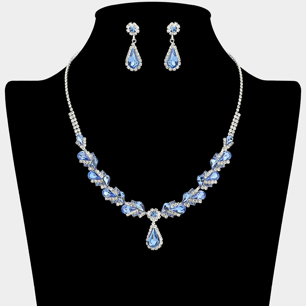 • This teardrop statement necklace and earring set features layered sparkle with elegant drop accents that frame the neckline beautifully. Designed for special occasions, formal events, and evening styling, it offers a refined coordinated look ideal for boutiques and gift-ready collections.