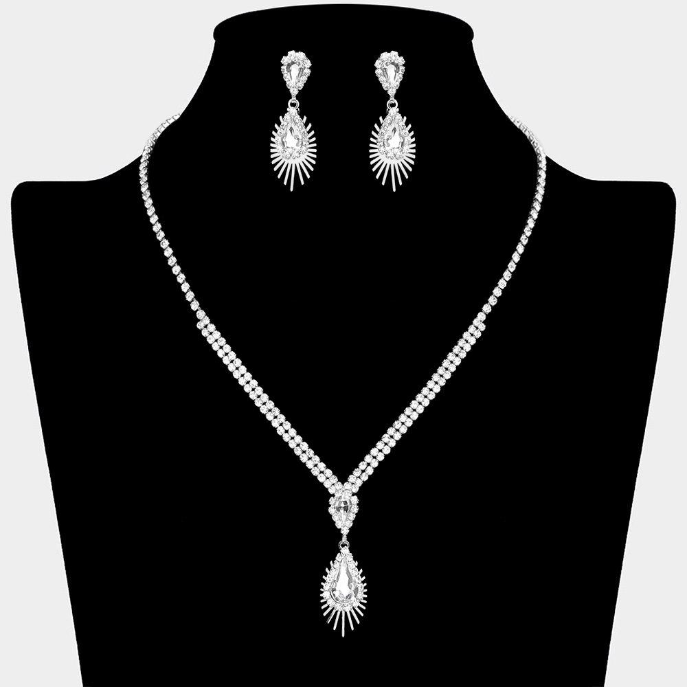 • Radiant teardrop necklace and matching earrings with sunburst detailing and shimmering stones. Designed for elegance and sophistication, this jewelry set adds a dazzling finish to wedding, prom, or evening looks, offering a timeless sparkle that enhances any glamorous outfit.