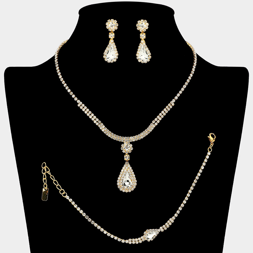 Details • Necklace Size : 16" + 4" L • Decor Size : 1.6" L • Bracelet Size : 0.4" H, 7" + 2" L • Earrings Size : 1.3" L • Enhance your special occasion look with this teardrop crystal necklace, bracelet, and earring set. Featuring a radiant drop pendant and dazzling crystal accents, this timeless jewelry ensemble exudes sophistication, making it perfect for brides, galas, and formal evening events.