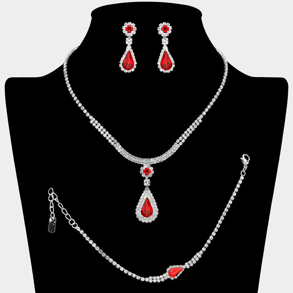 • Enhance your special occasion look with this teardrop crystal necklace, bracelet, and earring set. Featuring a radiant drop pendant and dazzling crystal accents, this timeless jewelry ensemble exudes sophistication, making it perfect for brides, galas, and formal evening events.