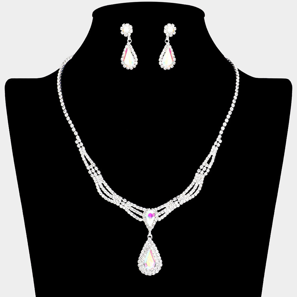 Details • Necklace Size : 16" + 4" L • Decor Size : 1.6" L • Earring Size : 1.2" L • Graceful jewelry set featuring a teardrop pendant necklace and matching earrings with shimmering stones. Designed with delicate multi-strand detailing, this elegant set adds timeless sparkle to weddings, proms, and evening looks, creating a radiant and sophisticated finishing touch. • Lead and Nickel Compliant