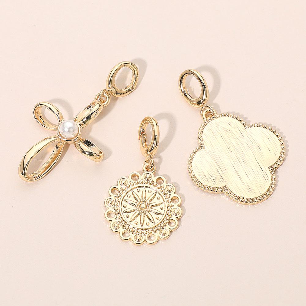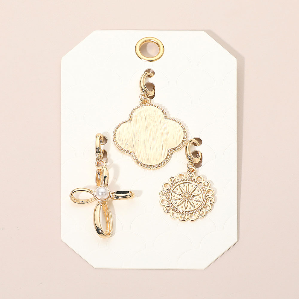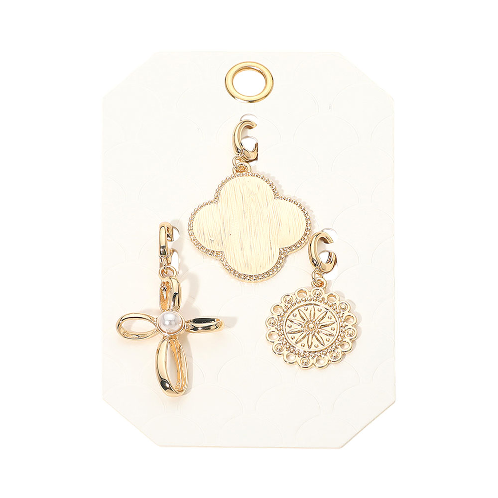 • Elevate your accessories with this elegant charm set featuring a quatrefoil medallion, cross motif, and textured round emblem. Designed to easily attach to chains, bracelets, or bags, these versatile charms enhance your look with a stylish, polished finish that complements any outfit.