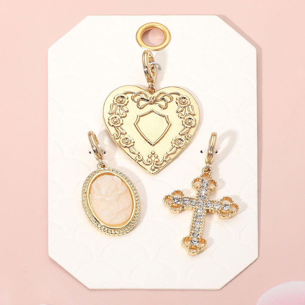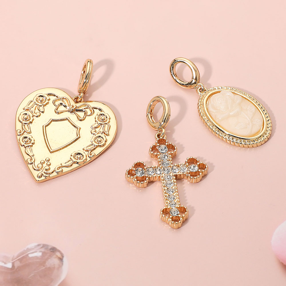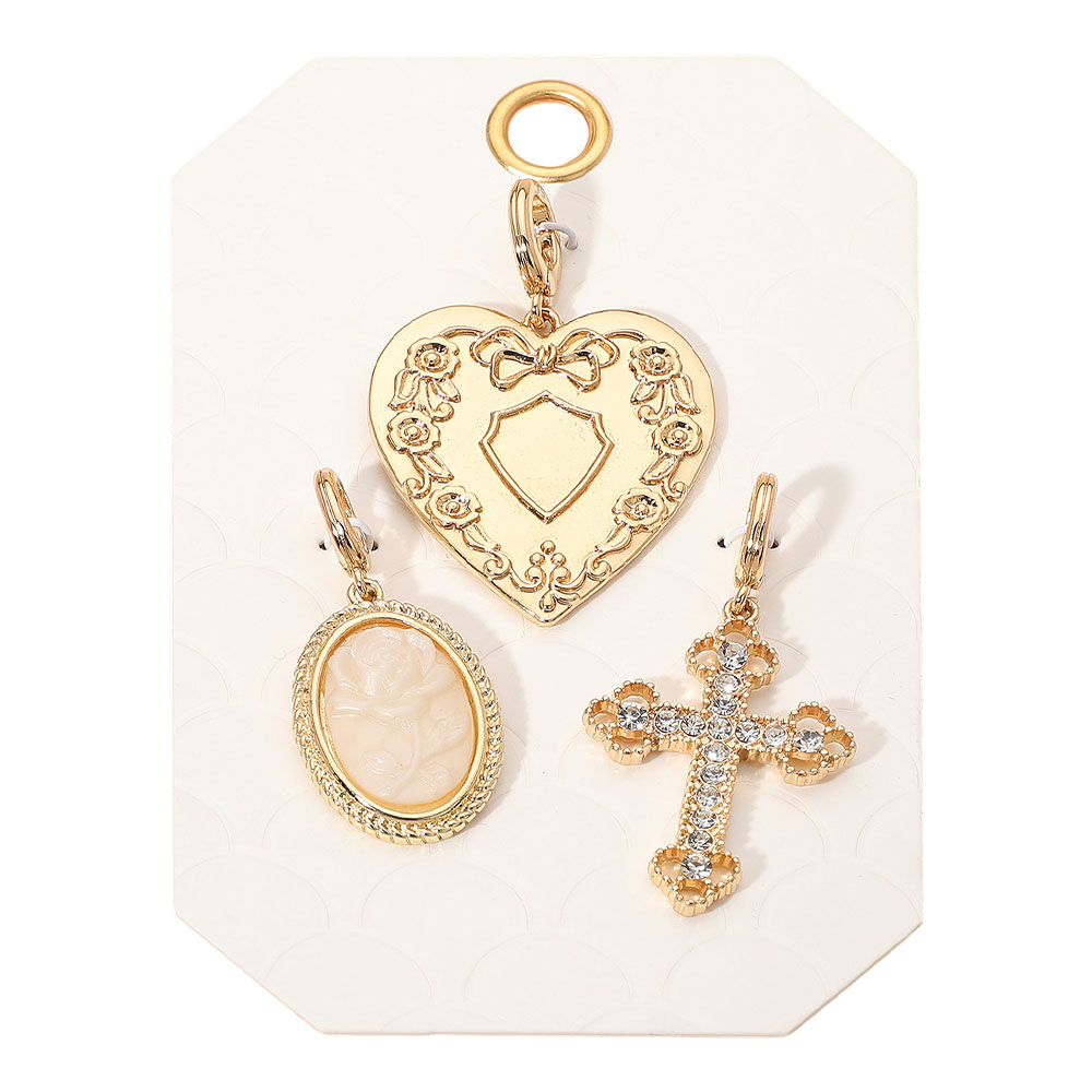 Details • Size : 1.75" L - 2" L • This elegant charm pendant set features three intricately designed pieces—a floral heart, a detailed cameo, and a crystal-accented cross. Perfect for adding a personal touch to chains or bracelets, these vintage-inspired charms offer timeless beauty and versatile styling options. • Lead and Nickel Compliant