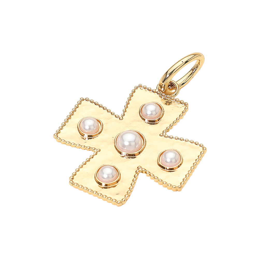 Details • Size : 1.75" X 2", 2.5" L • This elegant cross pendant charm features a refined design adorned with lustrous pearl-like accents, creating a timeless symbol of grace and faith. Its intricate beaded edges and polished finish make it a standout piece for necklaces or bracelets, perfect for meaningful, everyday elegance. • Lead and Nickel Compliant