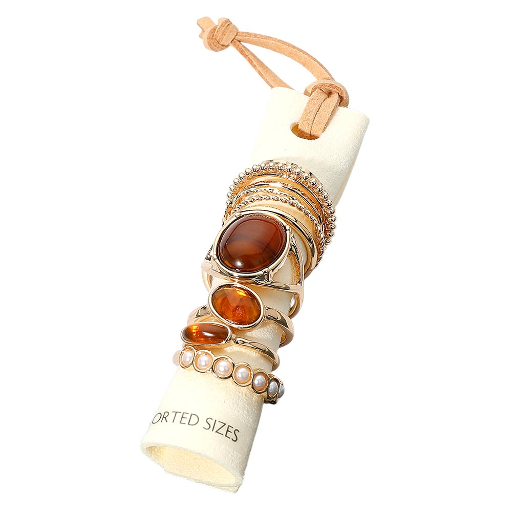 12PCS - Assorted Resin Stone Accent Pearl Link Textured Metal Stackable Ring Set