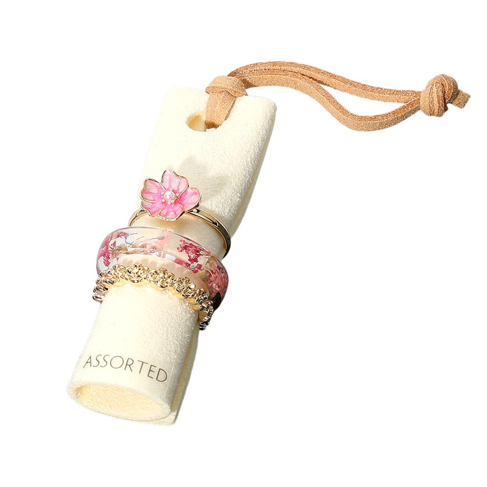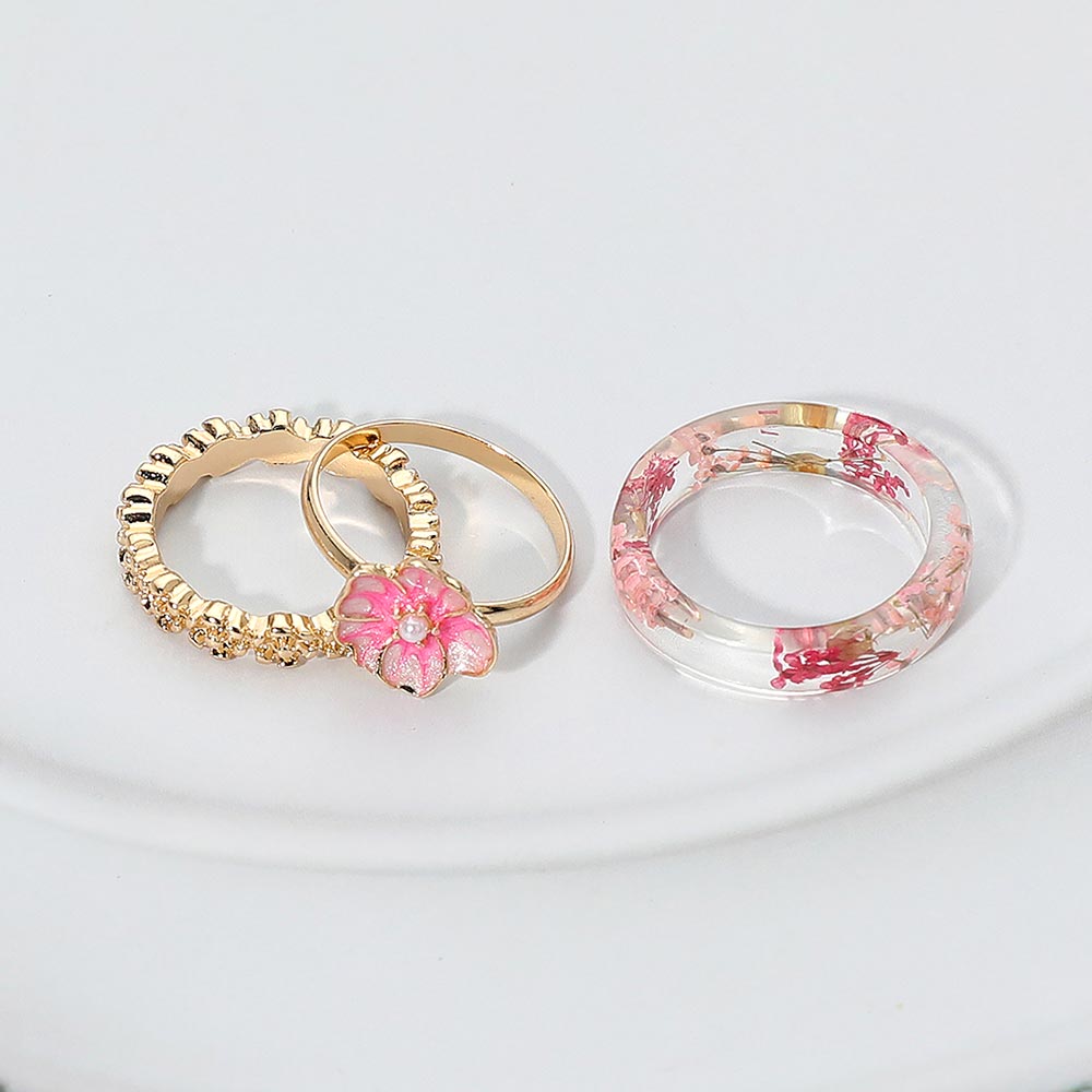 Details • Size : 0.2" - 0.4" H • Size 7 Only • A charming assorted ring set featuring a delicate floral ring, a clear resin band with embedded accents, and a textured stacking ring. Perfect for mixing and matching, gifting, or adding a playful, feminine touch to everyday looks with a unique blend of styles and textures. • Lead and Nickel Compliant