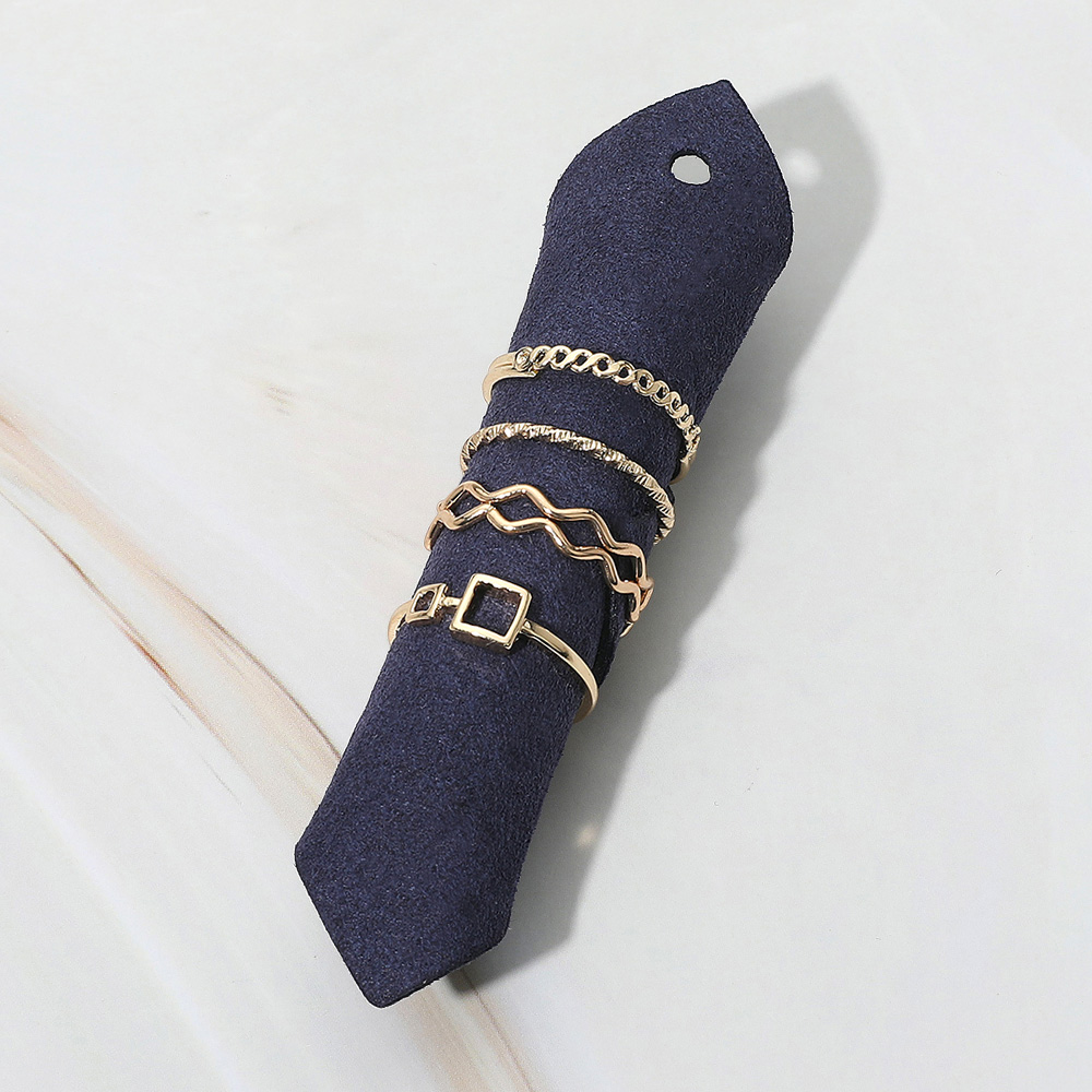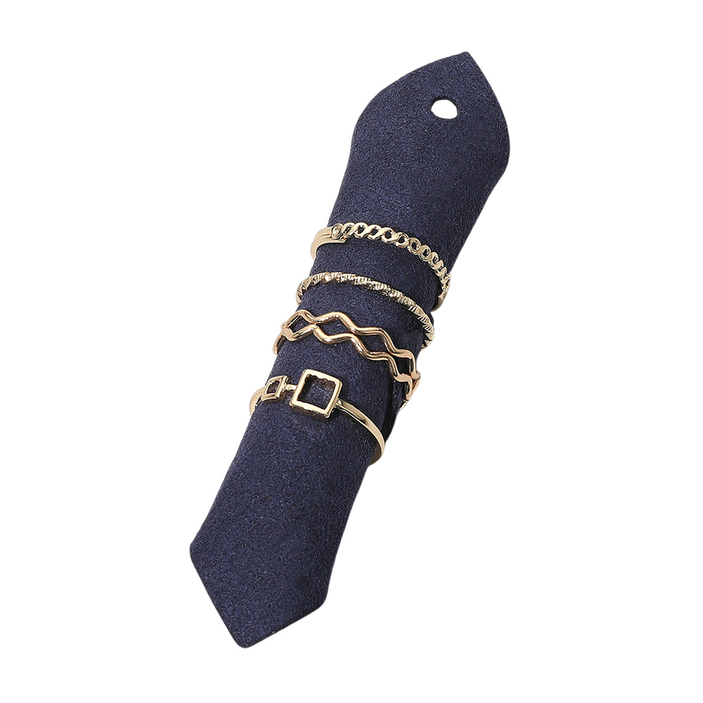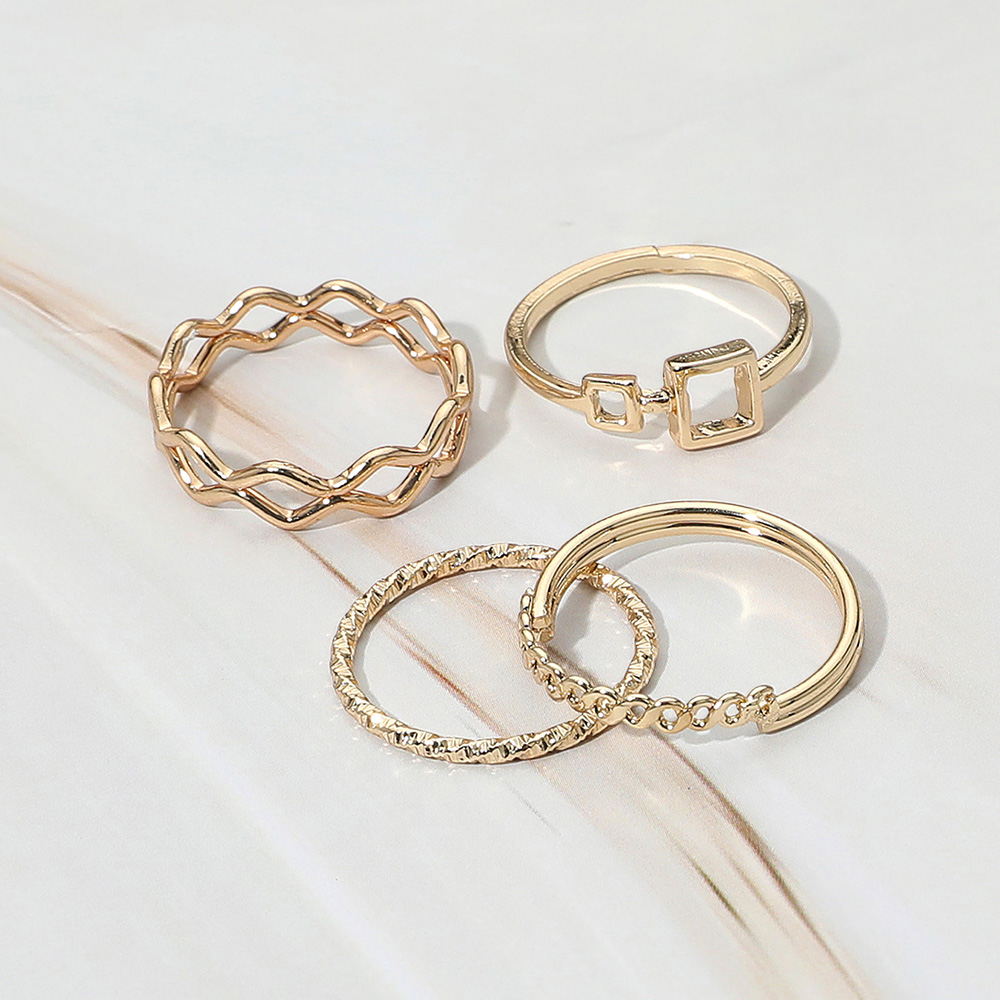 Details • Size : 0.1" - 0.25" H • Size 7 Only • This set of four stackable rings showcases a mix of geometric and textured designs, including chain links, zigzag patterns, and buckle accents. Perfect for layering or wearing individually, they add a versatile touch of modern elegance to any jewelry collection. • Lead and Nickel Compliant