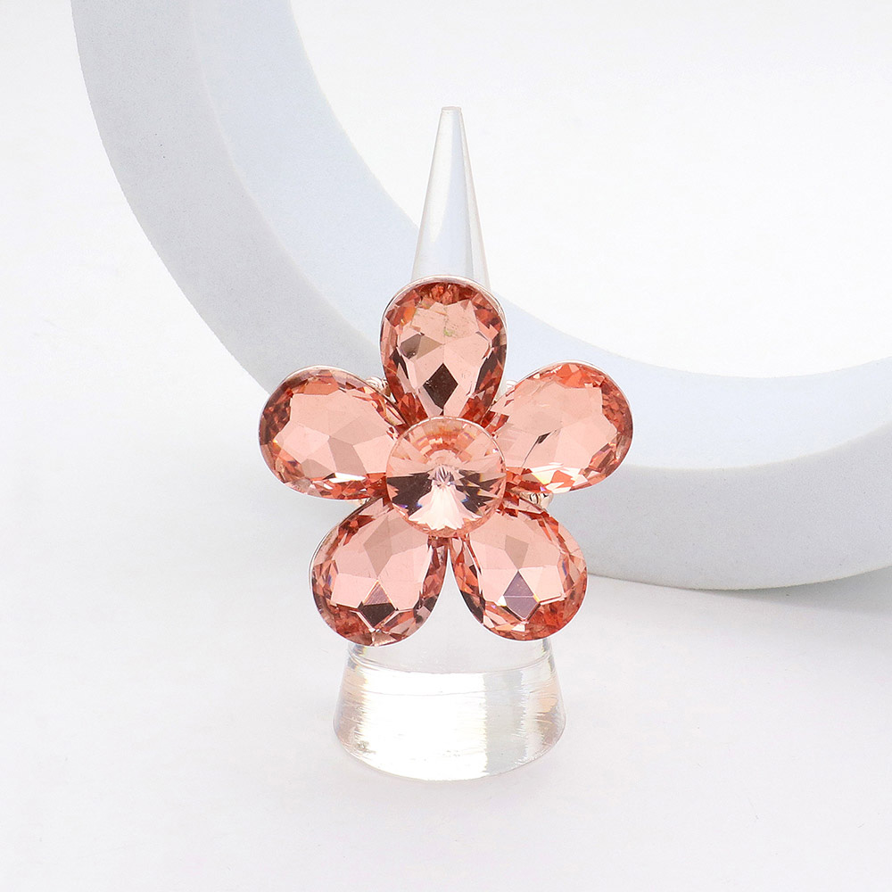 Details • Size : 1.5" H • Stretchable • Elegant flower-shaped statement ring featuring a dazzling faceted petal design that catches the light beautifully. Perfect for adding a bold, eye-catching accent to any outfit, this gem-inspired accessory enhances your style with its unique shape and sparkling radiance. • Lead and Nickel Compliant