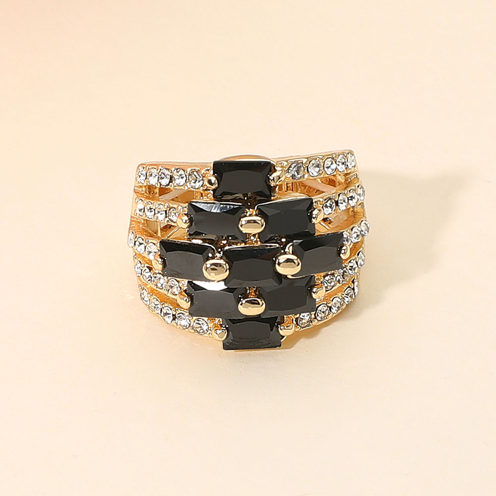 • This geometric crystal stretch ring showcases a bold multi-row design accented with radiant stones for a modern, statement-making appeal. Its flexible fit ensures comfort while adding a luxurious sparkle that enhances both evening ensembles and chic everyday outfits.
