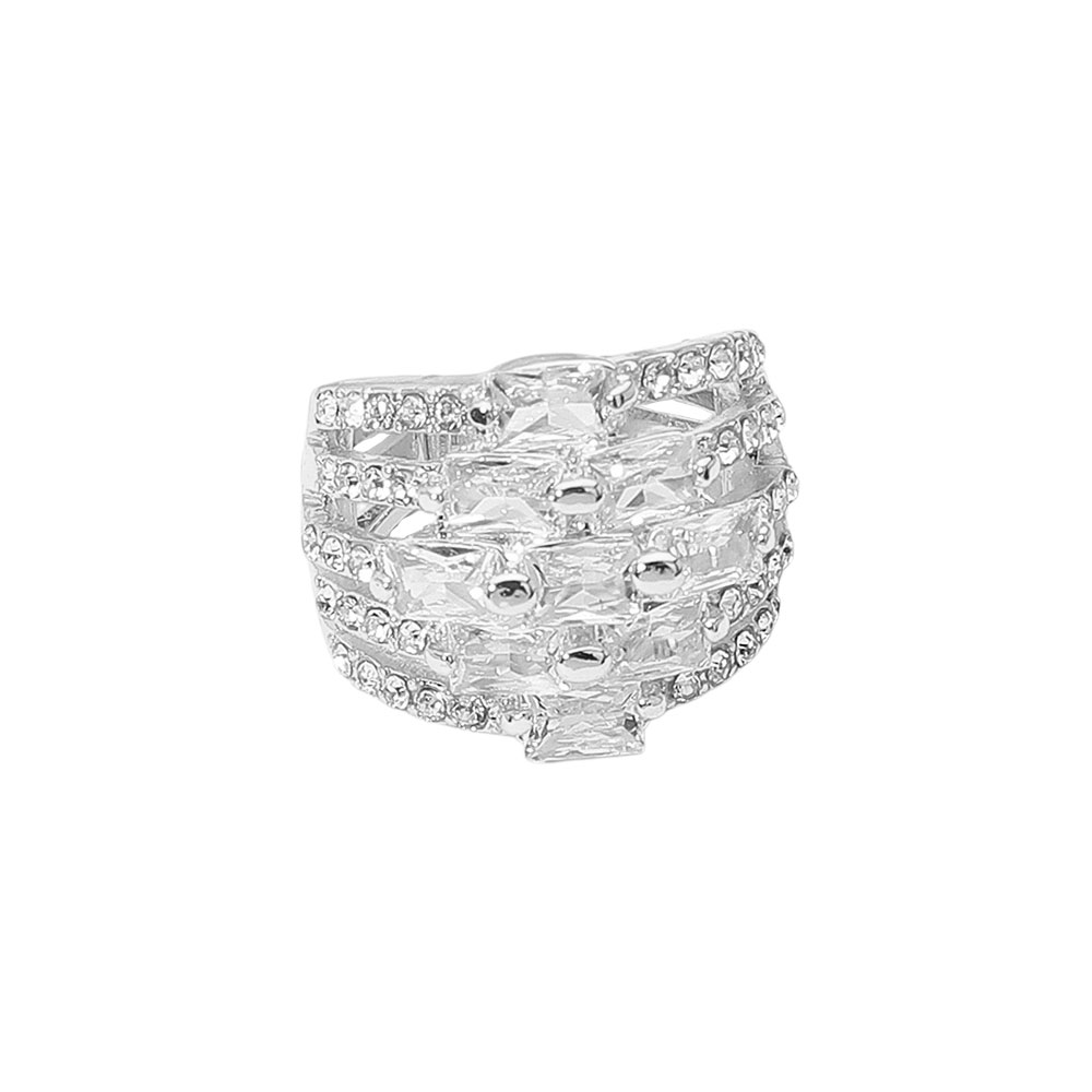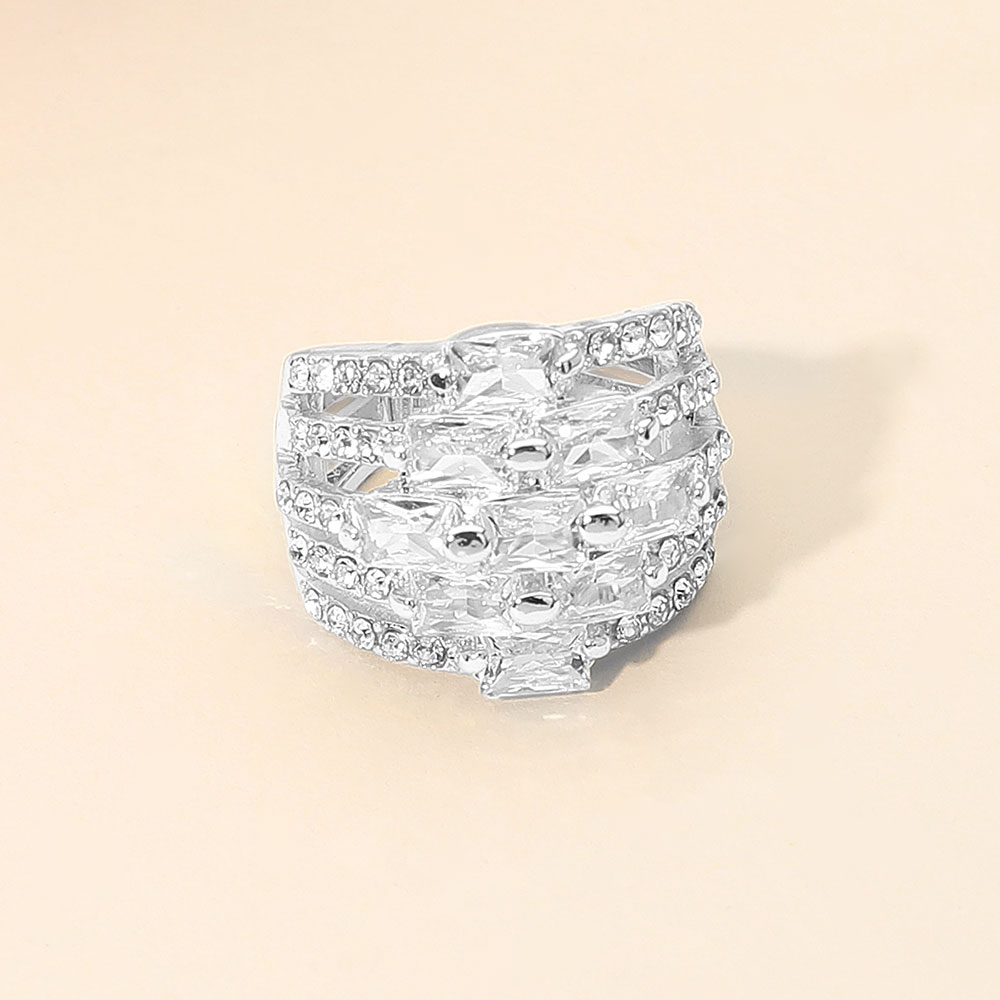 Details • Size : 0.8" H • Stretchable • This geometric crystal stretch ring showcases a bold multi-row design accented with radiant stones for a modern, statement-making appeal. Its flexible fit ensures comfort while adding a luxurious sparkle that enhances both evening ensembles and chic everyday outfits. • Lead and Nickel Compliant