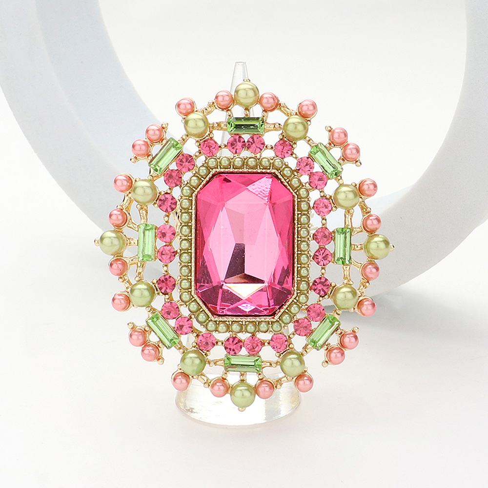 Rectangle Glass Stone Centered Pearl Rhinestone Embellished Stretch Ring