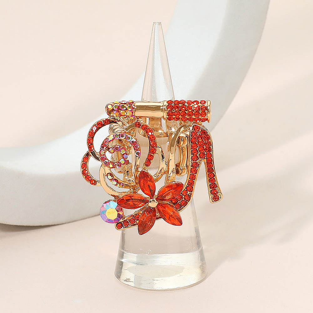 Rhinestone Embellished Flower Accent Glam High Heel Lipstick Pin Brooch