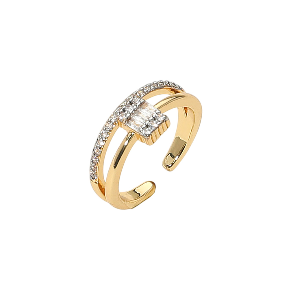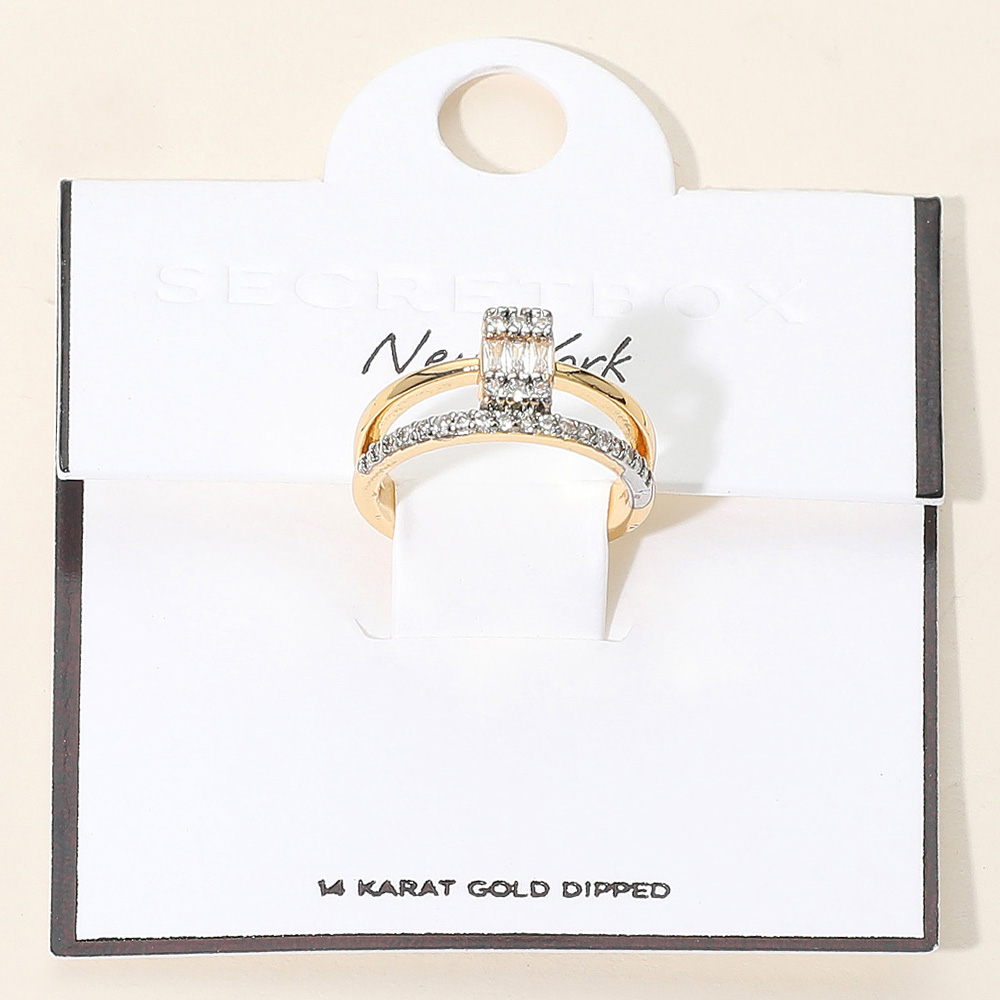 Details • Size : 0.4" H • Adjustable • Modern gold-tone adjustable ring featuring a dazzling baguette-cut crystal centerpiece flanked by delicate pave accents. A sleek and versatile accessory perfect for stacking or making a refined solo statement. • Gold Dipped