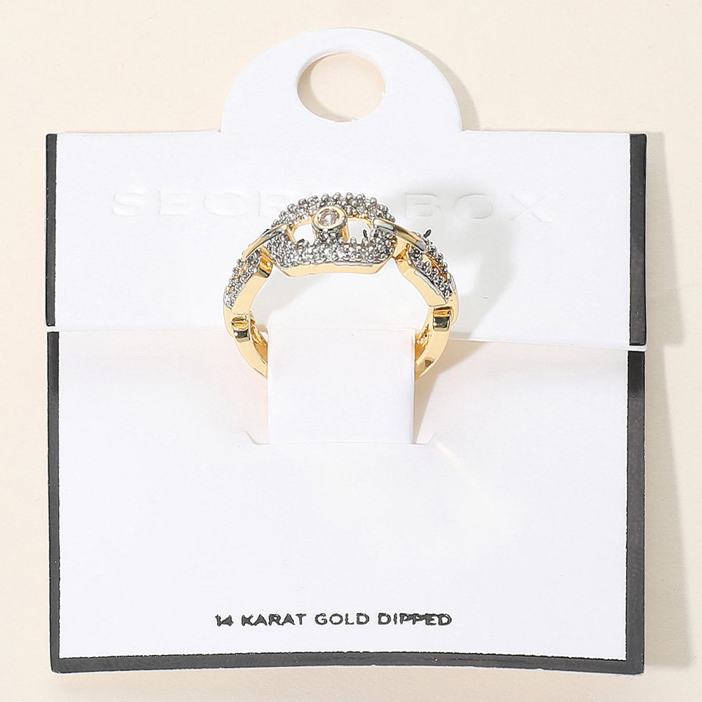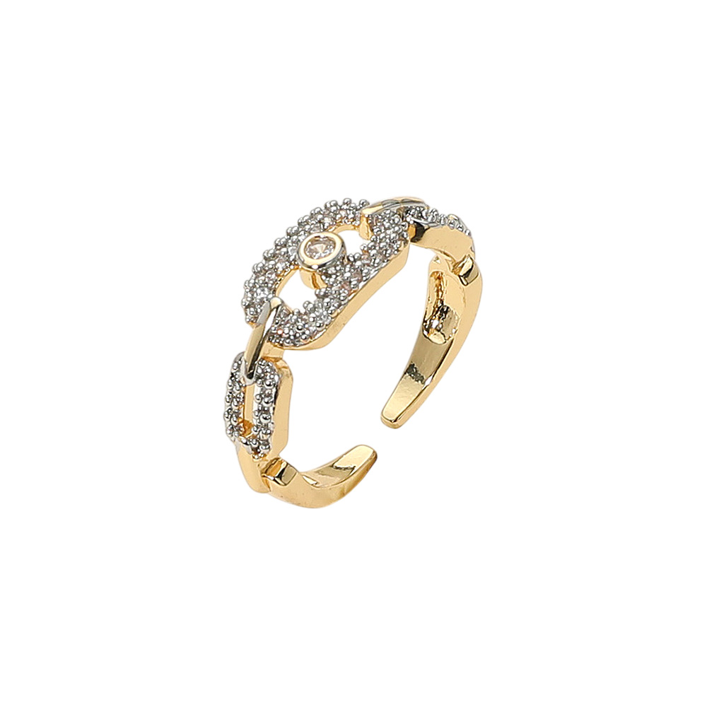 Details • Size : 0.3" H • Adjustable • Chic gold-tone adjustable ring featuring a crystal-embellished link design with a dazzling center stone. A stylish statement accessory that brings elegance and sparkle to everyday or special occasion wear. • Gold Dipped