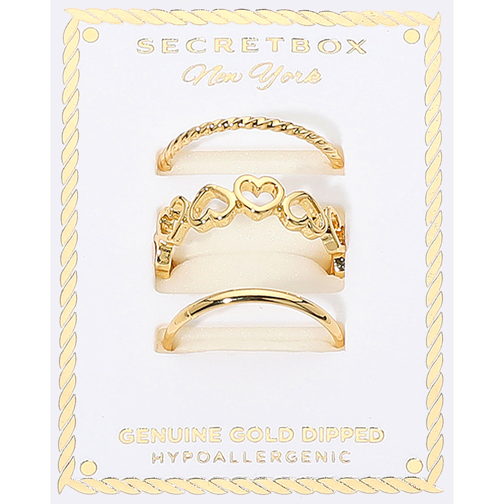 Details • Size : 0.1" - 0.2" H • Size 7 Only • Charming three-piece ring set featuring heart motifs and sleek bands. A playful blend of romance and simplicity, ideal for stacking or gifting with love. • Gold Dipped • Hypoallergenic