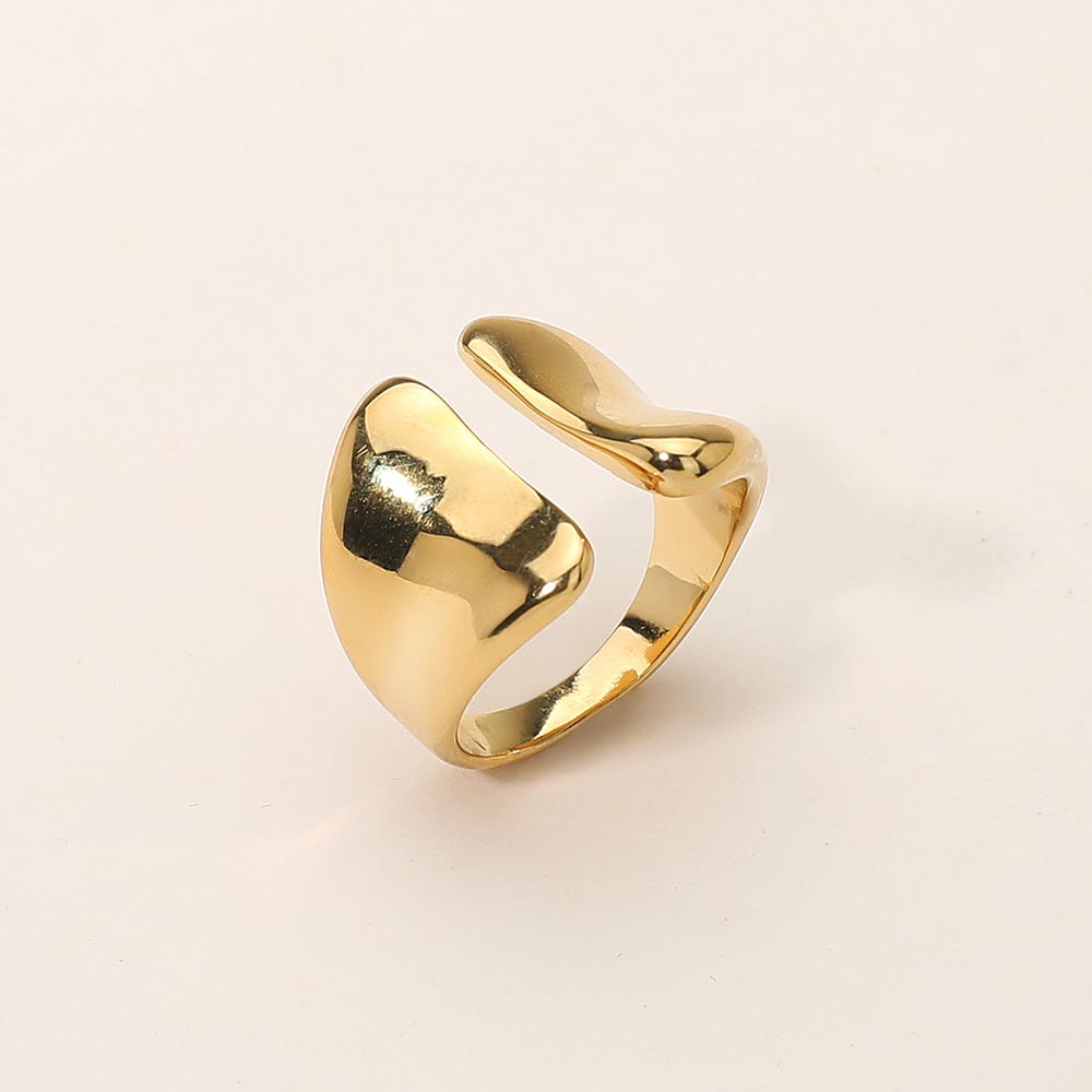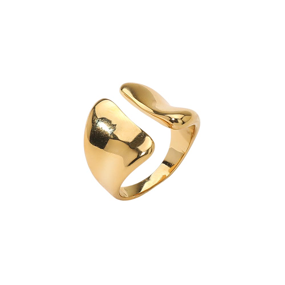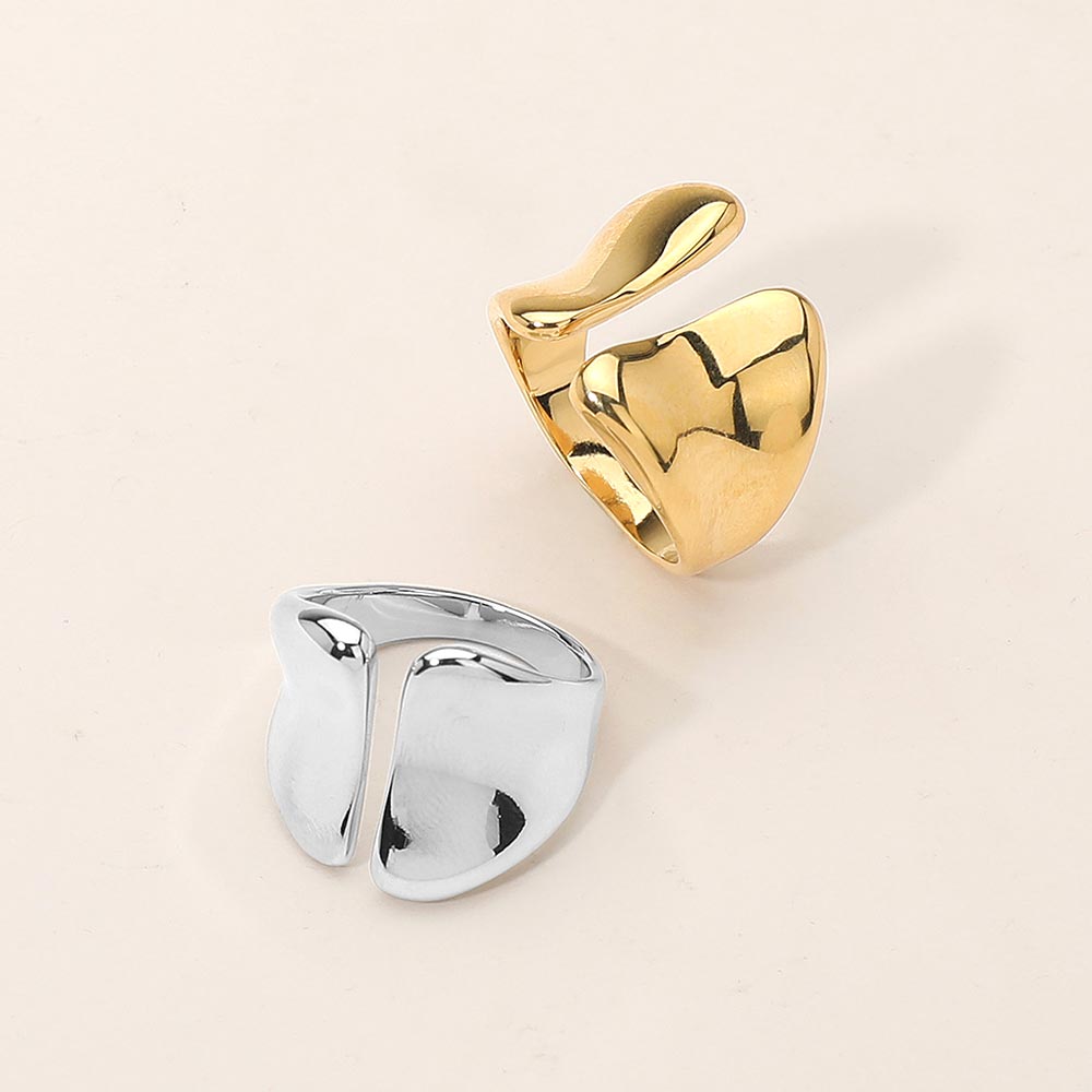 • Contemporary stainless steel open band ring showcasing a smooth, fluid organic shape with a bold sculptural finish. Designed for everyday elegance, this minimalist statement ring complements any outfit with its artistic and modern appeal, perfect for layering or solo wear.