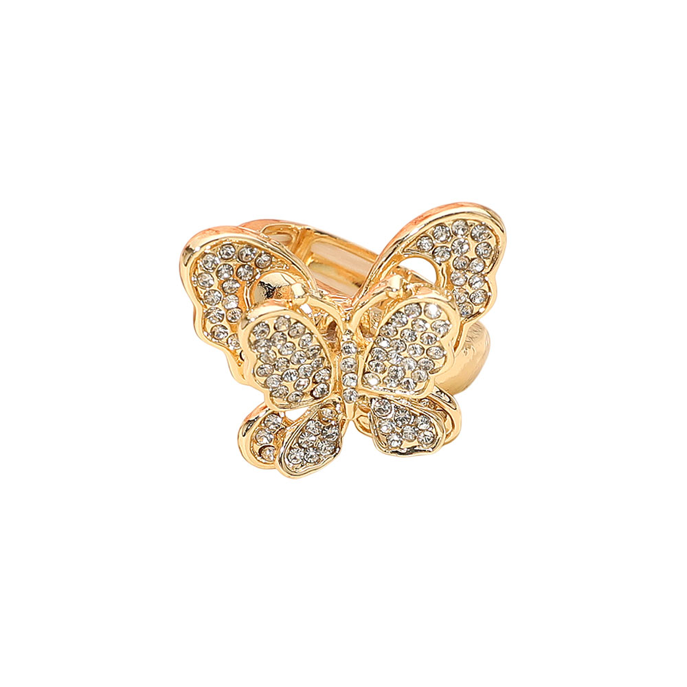 Details • Size : 0.8" H • Stretchable • This butterfly crystal statement ring captures the essence of elegance and whimsy with its sparkling stone-encrusted wings. Designed to shimmer beautifully from every angle, it’s the perfect accessory to express individuality and grace, adding charm to both day and evening looks. • Lead and Nickel Compliant