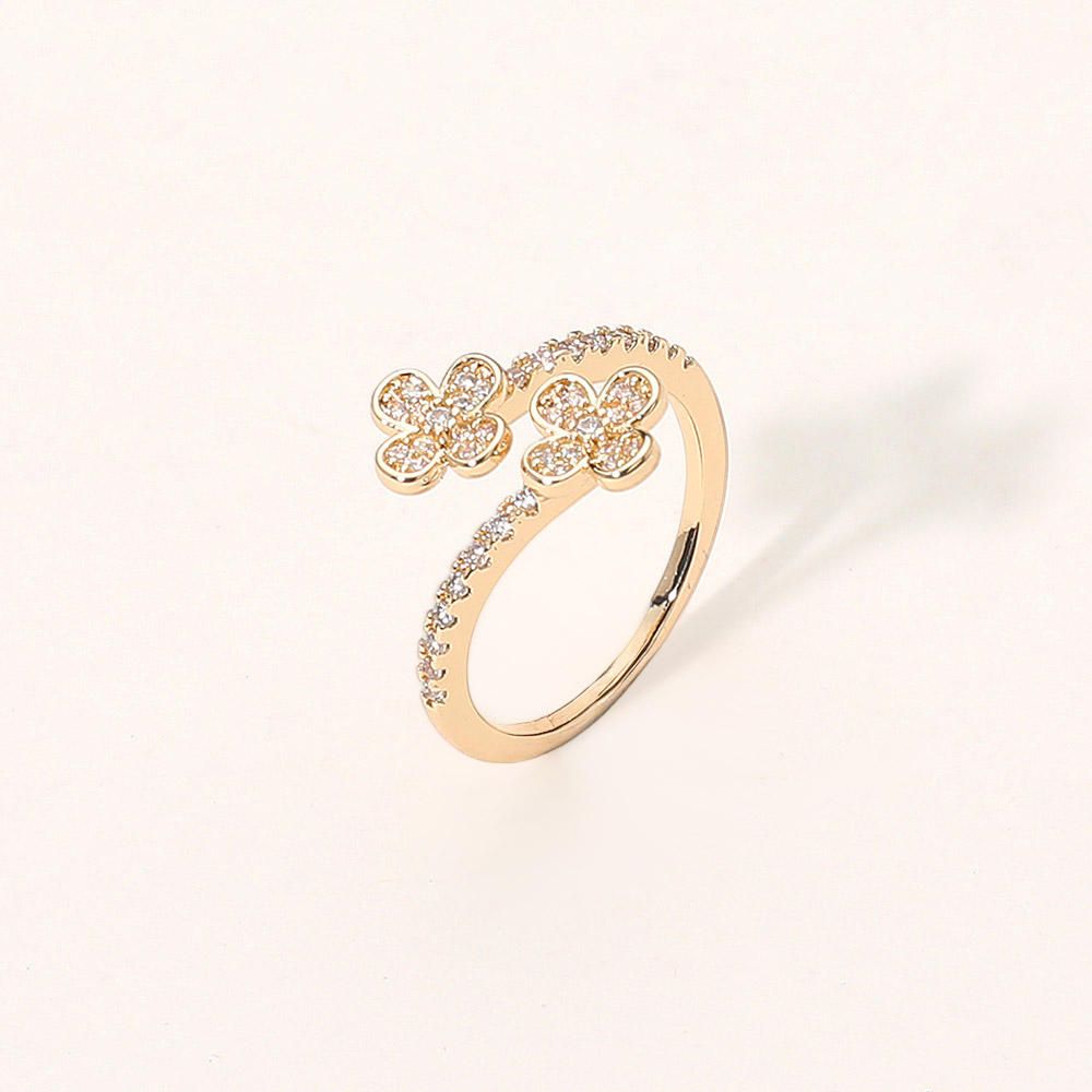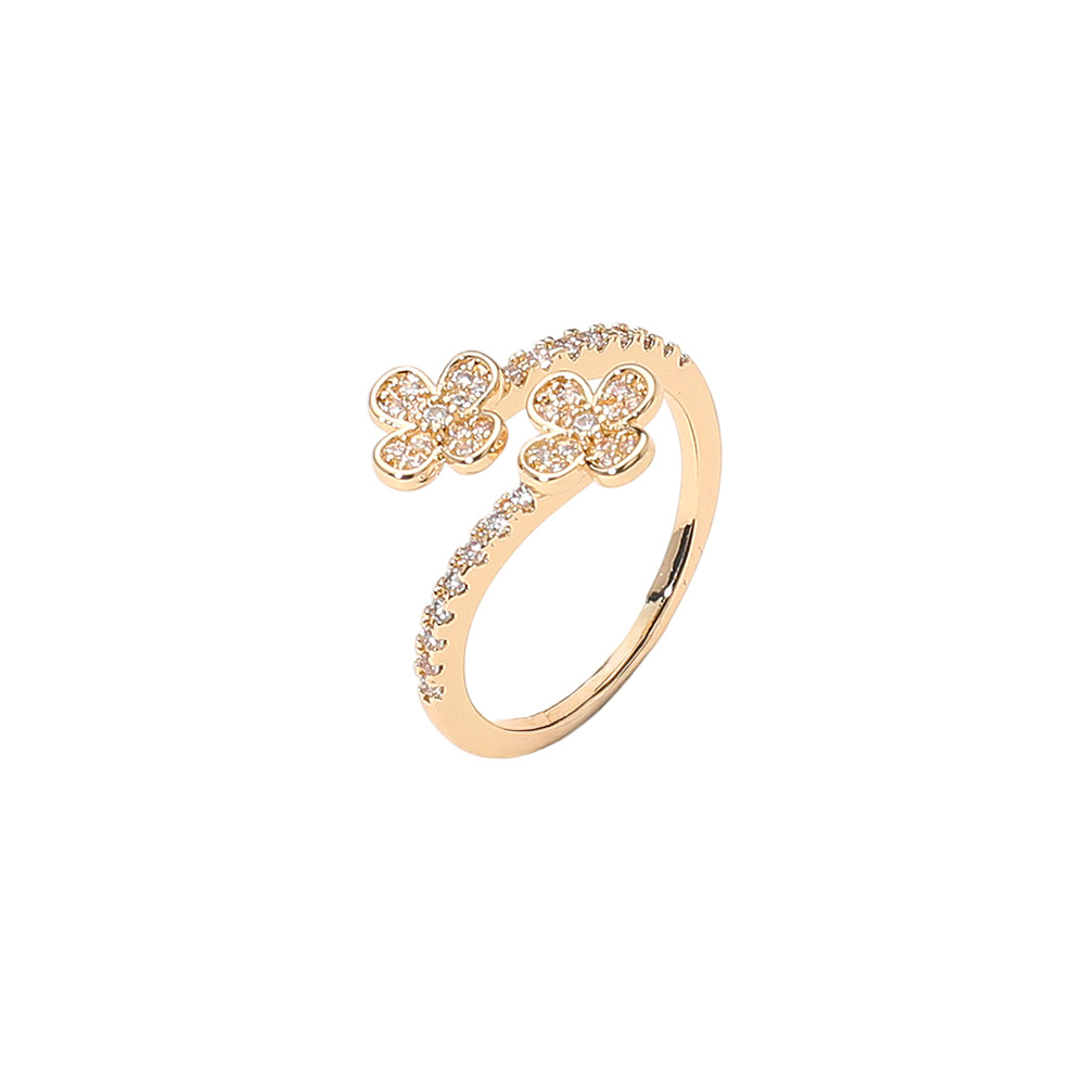 Details • Size : 0.5" H • Adjustable • Elegant adjustable ring featuring two sparkling quatrefoil designs for a feminine and stylish touch. Perfect for adding delicate charm to everyday wear or special occasions, this open-band ring offers comfort, shine, and timeless floral elegance. • Brass • Lead and Nickel Compliant