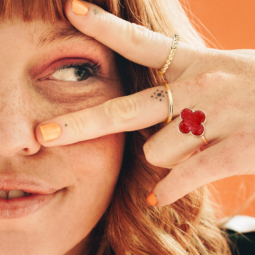 • Add a touch of charm with this dalmatian stone quatrefoil ring featuring a playful four-petal design. Lightweight and versatile, it’s perfect for stacking or wearing solo, bringing personality and a stylish edge to everyday outfits or special occasions.