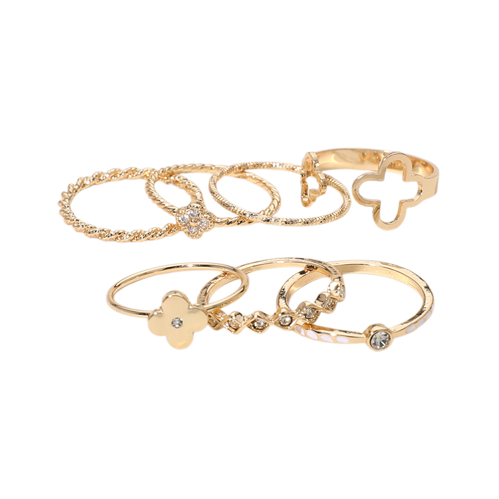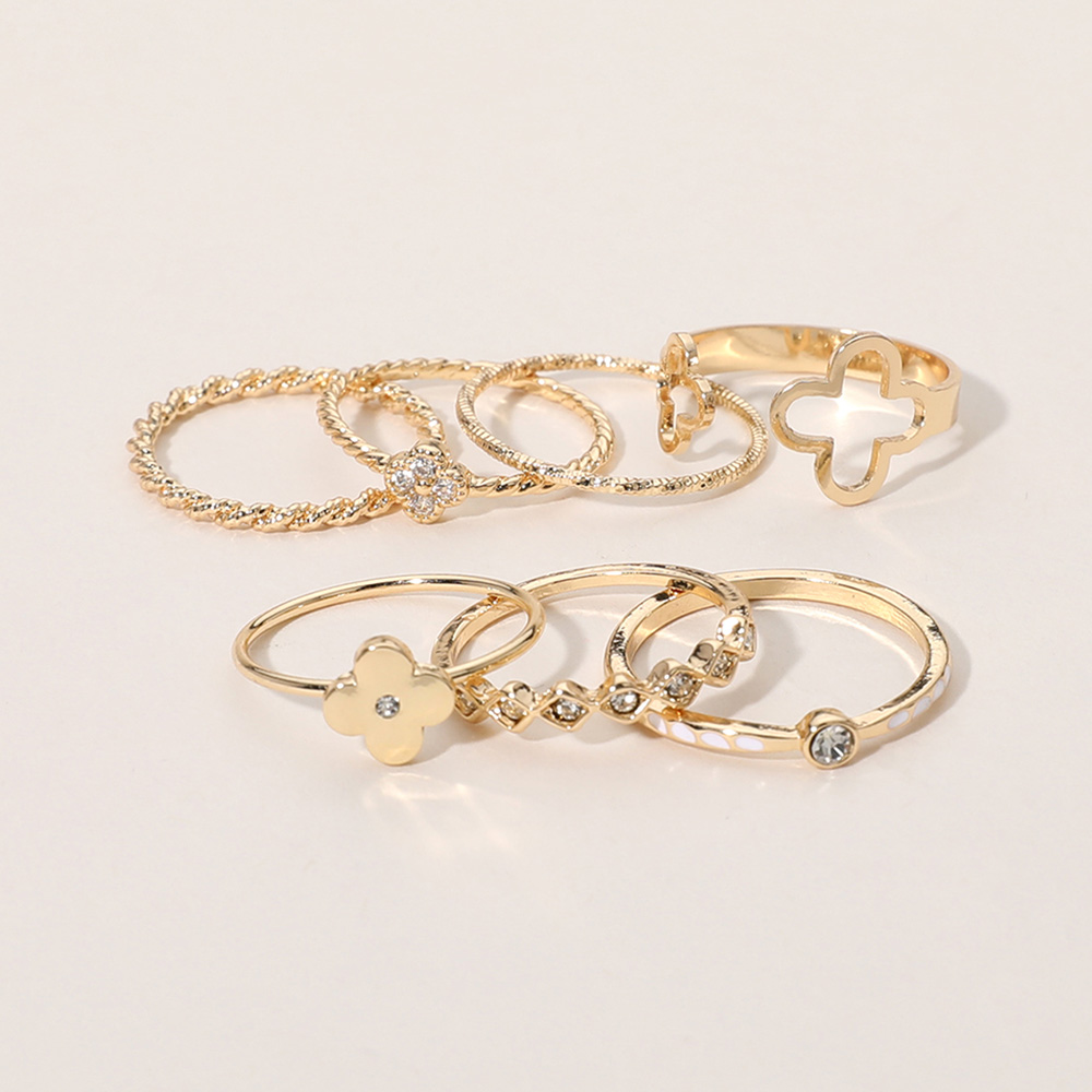 7PCS - Stone Pointed Quatrefoil Metal Rope Stackable Rings